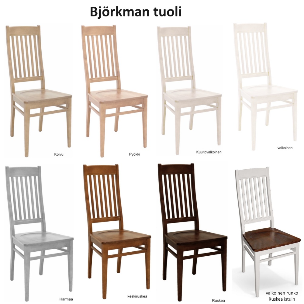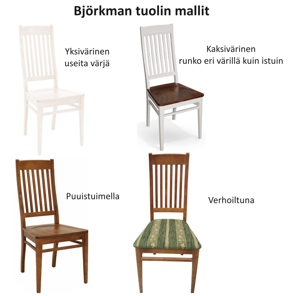 Ruokailutilan kokonaisuuden täydentävät Björkman-tuolit ja tarjoilupöytä, jotka ovat tilattavissa lisävarusteina. Tuoleja on saatavana kahdella korkeudella (93 cm ja 100 cm), puuistuimella tai verhoiltuna useilla kangasvaihtoehdoilla – juuri sinun tyyliisi sopivaksi.