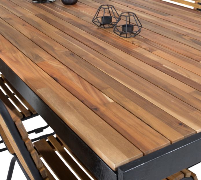 Pöydän kansi on koristeellista akaasiaa ja pöydän jalat tyylikästä metallia. Kutsu perhe ja ystävät nauttimaan illallista ulkotilaasi lämpiminä kesäiltoina. Jotta ulkokalusteet säilyttäisivät viimeistelynsä, ne tulee olla öljykäsitelty.
