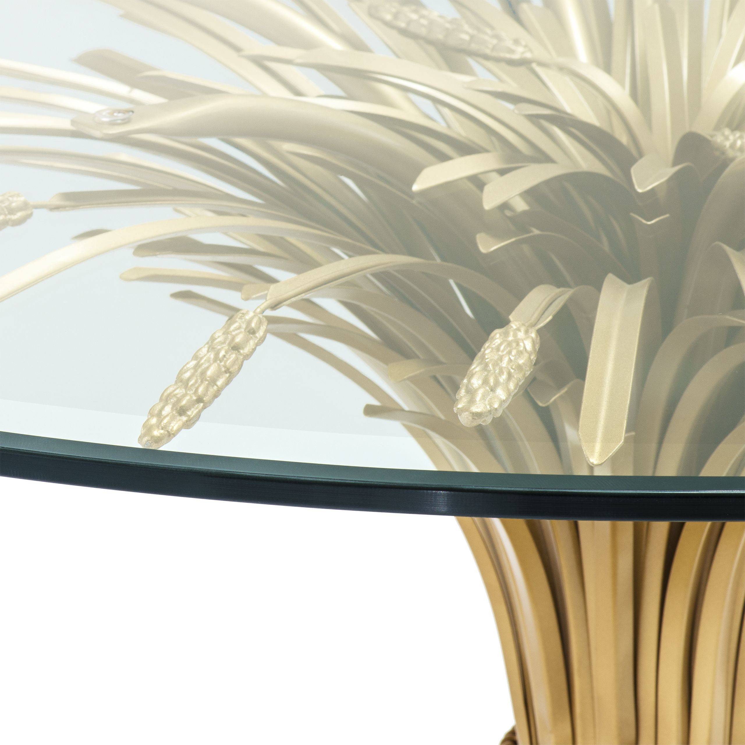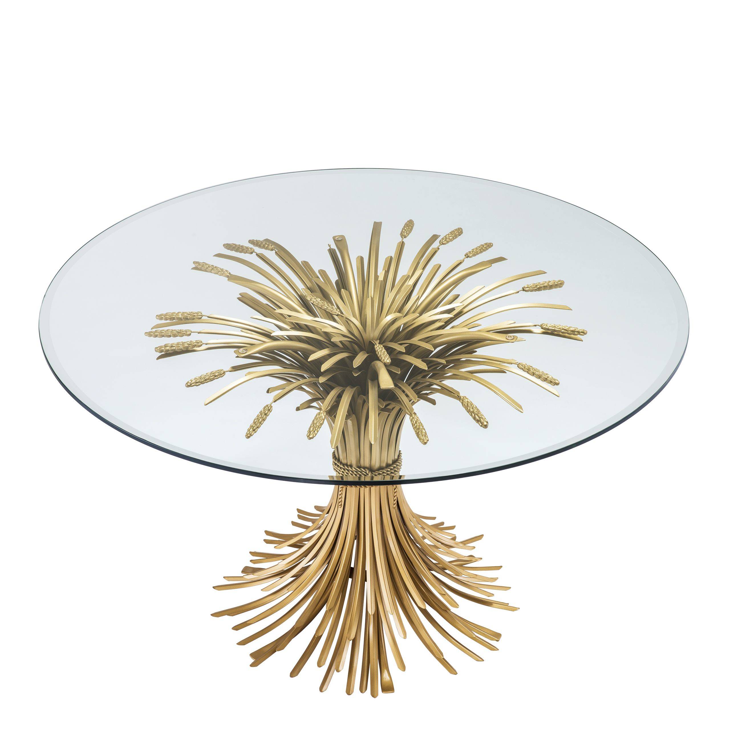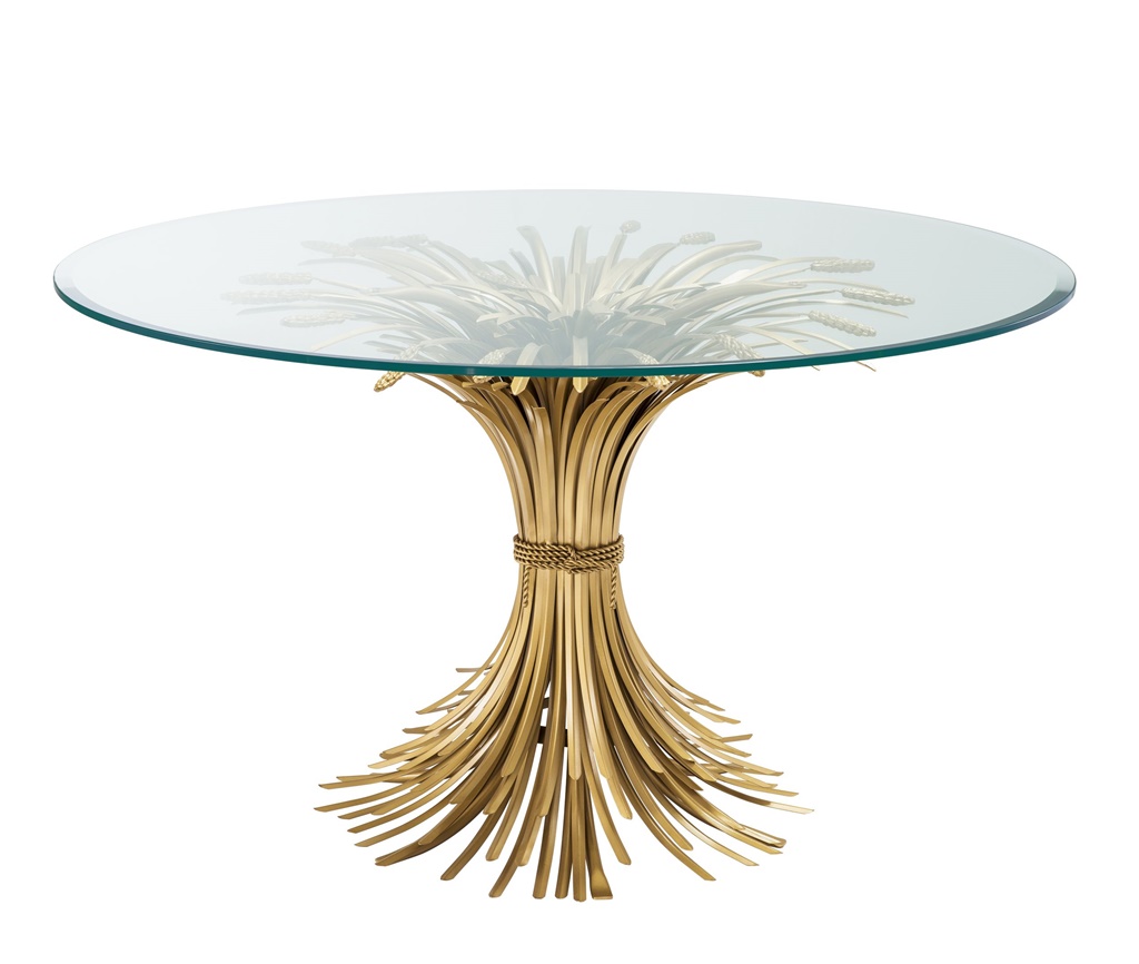 Bonheur pyöreä ruokapöytä yhdistää kirkkaan lasikannen ja näyttävät kullatut jalat, luoden ilmavan ja ajattoman tyylikkään ilmeen ruokailutilaan. Sen viljalyhdettä muistuttava jalka toimii upeana design-elementtinä ja tekee pöydästä vaikuttavan katseenvangitsijan.