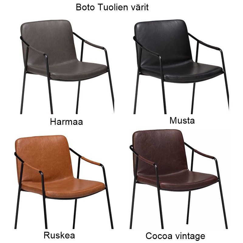 Boto-tuolin pehmeä keinonahkaverhoilu tuntuu miellyttävältä ja on helppo pitää puhtaana, tehden siitä käytännöllisen valinnan arjen käyttöön. Tukevat metallijalat tuovat modernia ilmettä ja varmistavat tuolin pitkäikäisyyden. Kestävä rakenne ja 2 vuoden takuu korostavat tuotteen korkeaa laatutasoa.
