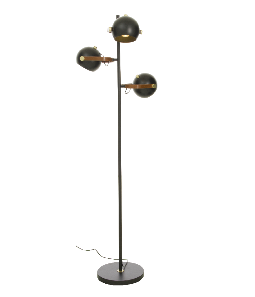 Kestävä metallirunko, tekonahkaiset yksityiskohdat ja metallikuvut takaavat viimeistellyn ja pitkäikäisen lopputuloksen. 152 cm korkea rakenne ja GU10-kantaiset valonlähteet (3 x 7 W) tarjoavat tehokasta valaistusta säilyttäen valaisimen sirot ja modernit mittasuhteet.