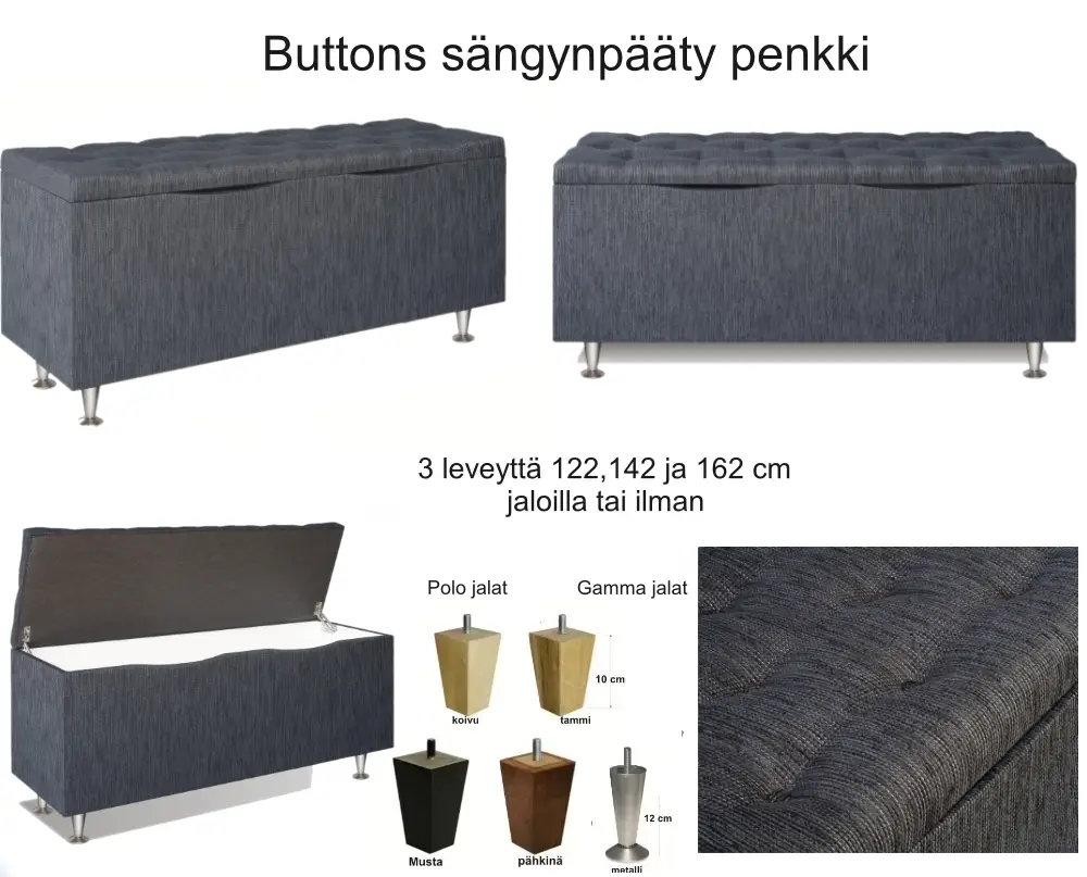 Buttons-sängynpääty on suorakaiteen muotoinen, jossa verhoilukankaalla verhoiltuja nappeja, joka luo makuuhuoneeseen ylellisen ja huolitellun ilmeen. Päädyllinen sänky tekee sängystä näyttävän kokonaisuuden ja sulautuu vaivatta niin moderniin, klassiseen kuin minimalistiseen sisustukseen.