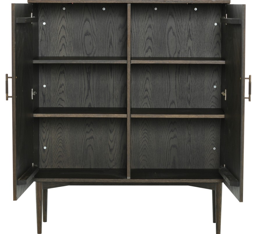 Harjatun messingin väriset vetimet korostavat kaapin ylellistä muotoilua ja tuovat lämpimän kontrastin tummalle puulle. Bygdöy kaappi sopii täydellisesti olohuoneeseen, eteiseen tai ruokailutilaan – minne tahansa tarvitset kauniin ja toimivan lisätilan.