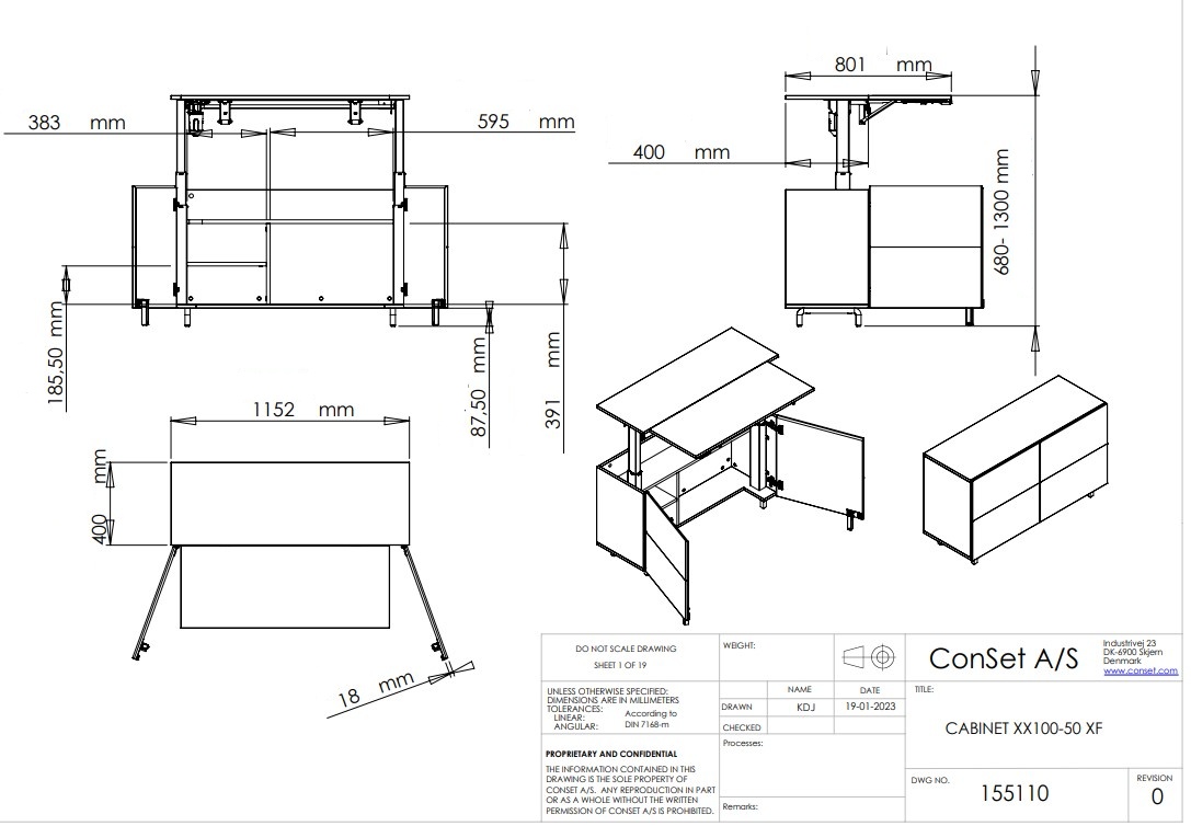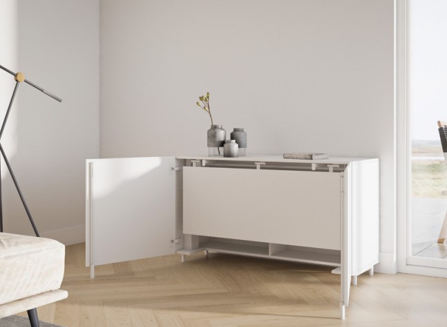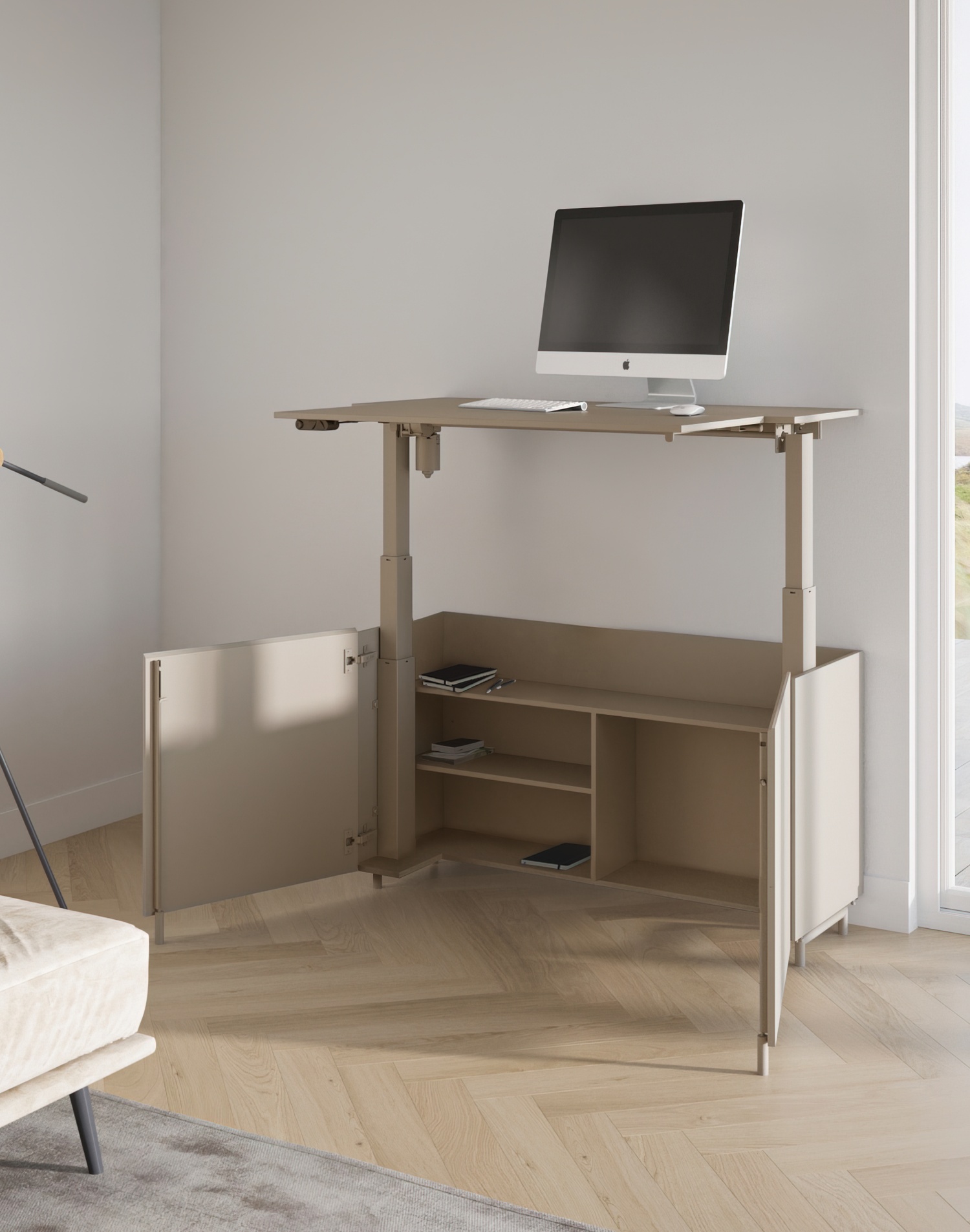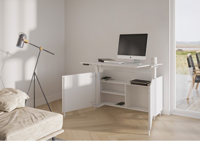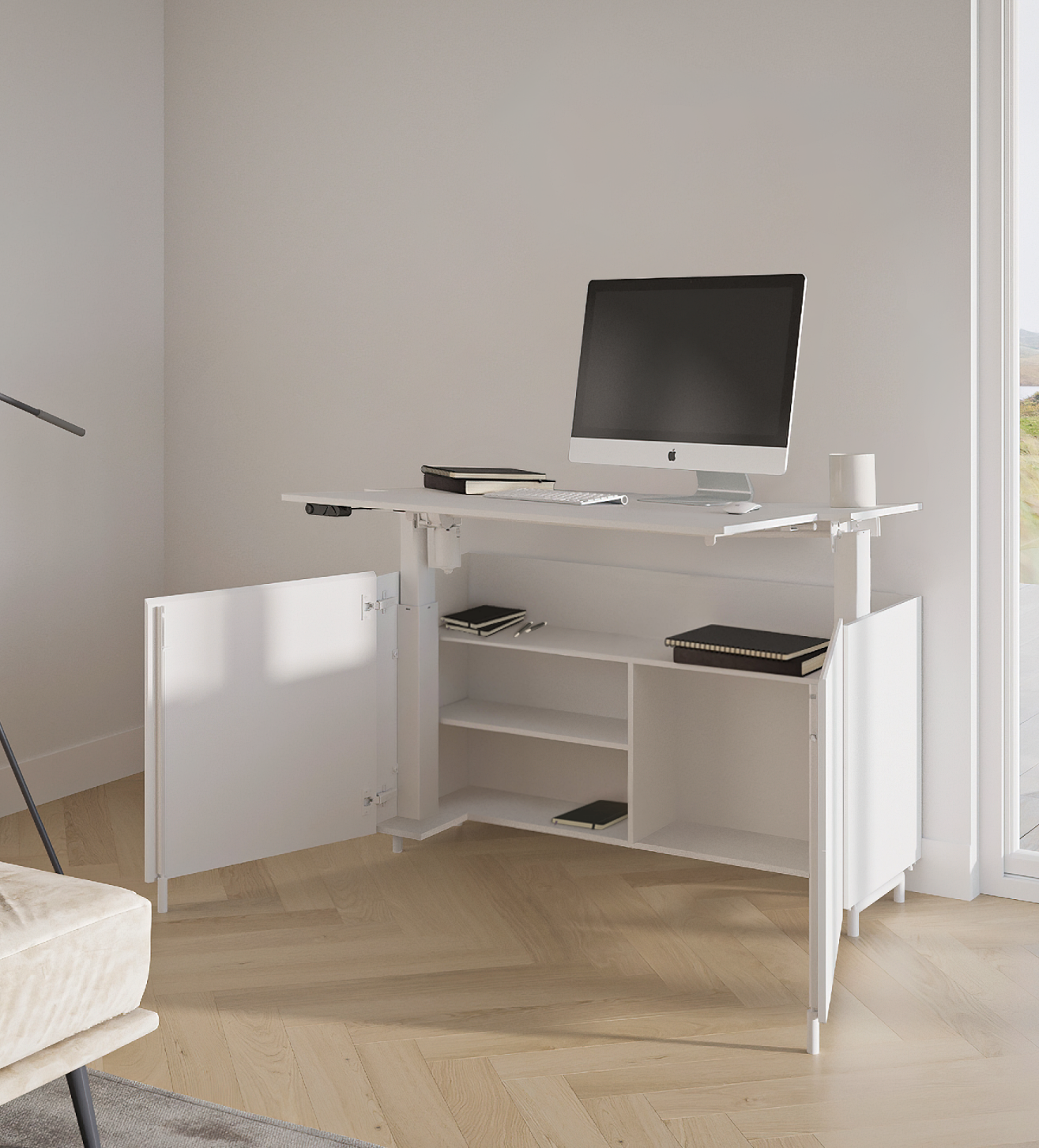 Kaappi muuttuukin senkistä sähköiseksi seisomapöydäksi kahdessa helpossa vaiheessa! Avaa ovet ja käännä oveen kiinnitetyt jalat alas pöydän tukemiseksi ja sen jälkeen käännä ylös etupöytälevy, jossa on automaattinen lukitusjärjestelmä. Siirrä sitten työpöytä haluamallesi korkeudelle ja aloita työskentely. Pöydän kokoontaittaminen on erittäin helppoa ja vaivatonta.