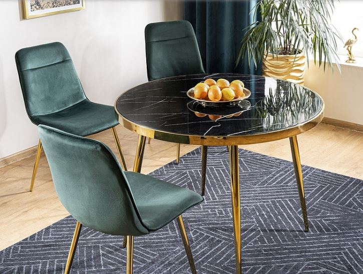 Caceres-ruokapöytä yhdistää kultaisen metallirungon ja mustan marmorikuvioidun lasipinnan, luoden näyttävän ja ylellisen kokonaisuuden, joka sopii täydellisesti moderniin sisustukseen. Sen huolellisesti viimeistellyt yksityiskohdat tekevät pöydästä tilan tyylikkään keskipisteen.