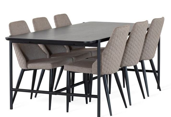 Ryhmään sisältyy 6 kappaletta harmaita Flair-tuoleja, joissa mustat metallijalat ja kangasverhoilu yhdistävät mukavuuden ja modernin tyylin. Ergonominen muotoilu ja miellyttävä istuinkorkeus takaavat hyvän istuinmukavuuden myös pidempiin ruokailuhetkiin.