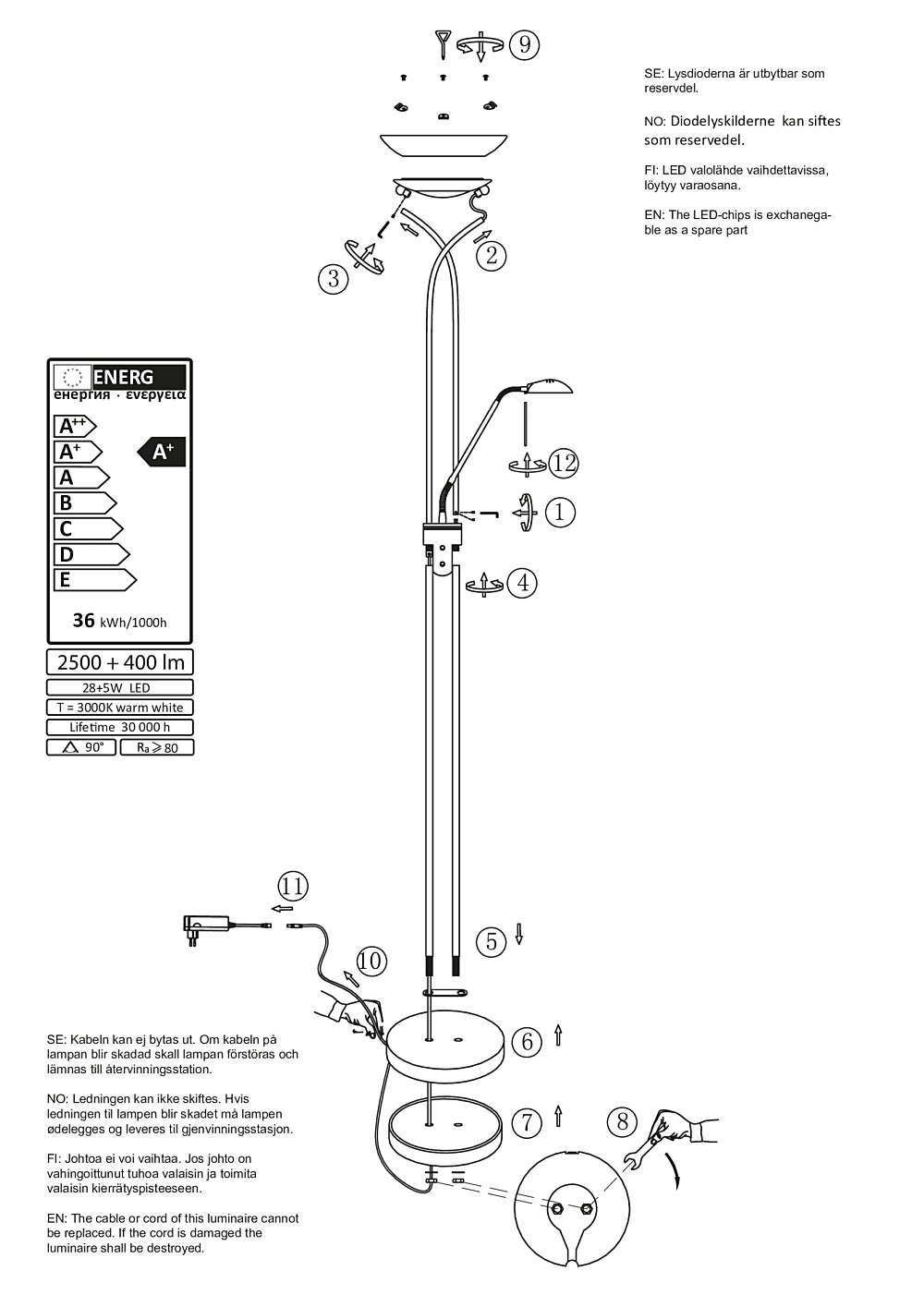 Yleisvalo tuottaa jopa 2500 lumenin kirkkauden ja lukuvalo 400 lumenia miellyttävällä 3000K lämpimän valkoisella sävyllä. Mukana toimitettavat LED-valonlähteet takaavat pitkäikäisen ja huolettoman käytön, ja 200 cm virtajohto helpottaa sijoittelua eri puolille huonetta.