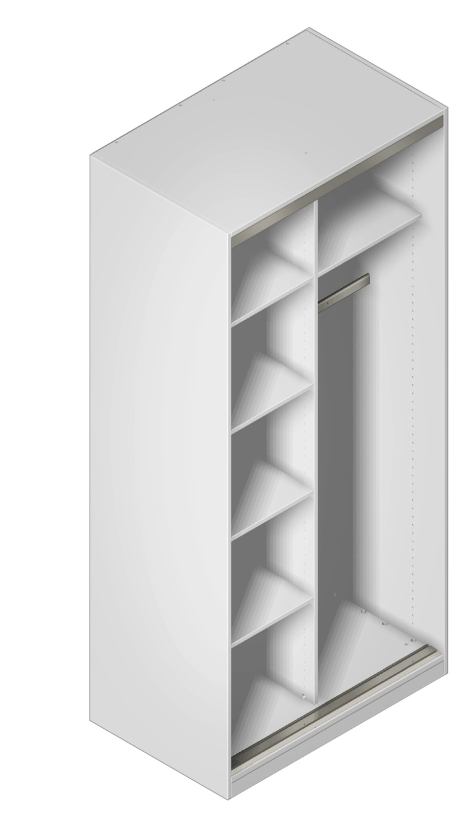 Vakiona mukana tuleva väliseinä, viisi kapeaa hyllyä sekä vaatetanko tarjoavat runsaasti tilaa vaatteille, asusteille ja kodin tarpeille. Komeroon on helppo lisätä lisävarusteita, mikä tekee siitä joustavan ratkaisun muuttuviin säilytystarpeisiin.