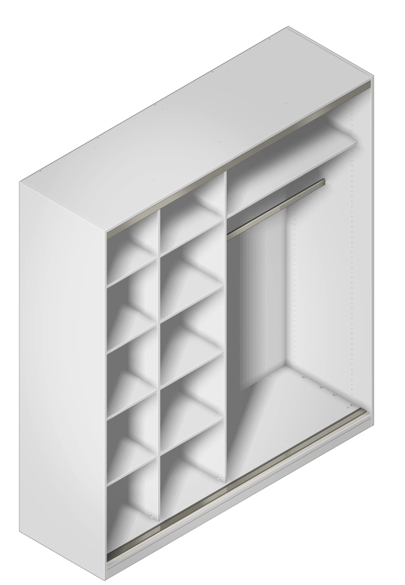 Komeron runko on valmistettu vahvasta 22 mm MFC-kalustelevystä, joka takaa pitkäikäisyyden ja tukevuuden. Antrasiitin väriset liukuovet liikkuvat kevyesti ja hiljaisesti metallikiskoilla, tehden päivittäisestä käytöstä miellyttävää ja sujuvaa.