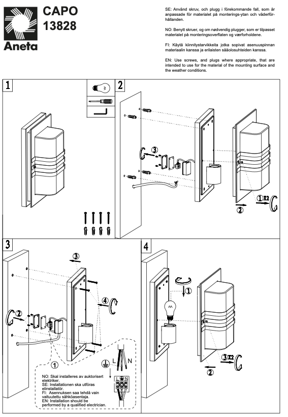 | 22 cm | 13.8 cm | 33 cm | cm | cm | cm | cm | cm | cm | cm | cm | cm | cm | cm | cm | cm | cm | cm | cm | cm | cm | cm | cm | cm | cm | cm | cm | cm | cm | Tilaustuote | 1.6 kg | cm | cm | cm | Ruostumaton teräs | IP44, Polttimo: E27, polttimon määrä 1 kpl, Polttimo ei sisälly hintaan, Teho: 40W, Seinäkiinnitys | Musta |