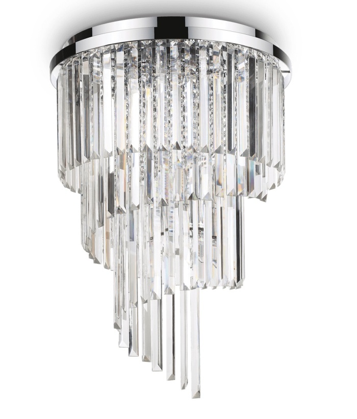Kaunis Carlton PL12 kristallinen kattovalaisin tuo tilaan säihkettä ja arvokasta eleganssia. Kahdeksankulmaisista kristalliketjuista ja leikatusta kristallista muodostuvat koriste-elementit heijastavat valoa näyttävästi, luoden rikkaan ja moniulotteisen valaistuksen, joka korostaa sisustuksen hienostuneita yksityiskohtia.