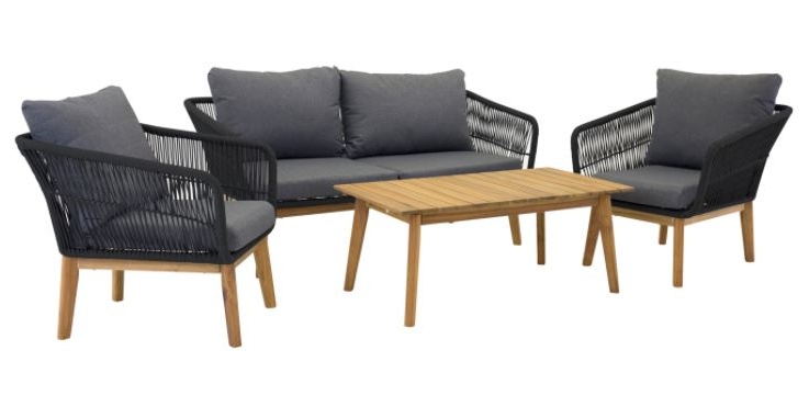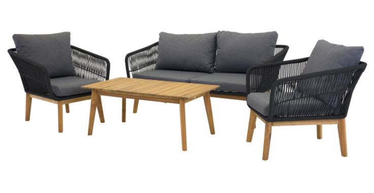 Chania on trendikäs sekä moderni sohvaryhmä, joka keskittyy mukavuuteen. Sohvan ja nojatuolien lisäksi ryhmään kuuluu matala sohvapöytä joka on valmistettu kokonaan akaasiapuusta. Nojatuoli ja sohvat ovat valmistettu alumiinista ja niissä on akaasiajalat. Tuolien selkä ja sivut on punottu mustalla köydellä antaen tyylikkään muotoilun. Akaasiansävyiset jalat yhdessä sohvapöydän kanssa luovat ainutlaatuisen yhtenäisen kokonaisuuden.