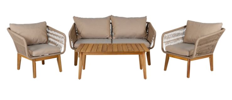 Chania on trendikäs sekä moderni sohvaryhmä, joka keskittyy mukavuuteen. Sohvan ja nojatuolien lisäksi ryhmään kuuluu matala sohvapöytä joka on valmistettu kokonaan akaasiapuusta. Nojatuoli ja sohvat ovat valmistettu alumiinista ja niissä on akaasiajalat. Tuolien selkä ja sivut on punottu beigellä köydellä antaen tyylikkään muotoilun. Akaasiansävyiset jalat yhdessä sohvapöydän kanssa luovat ainutlaatuisen yhtenäisen kokonaisuuden. Pehmeät istuintyynyt sisältyvät tuotteeseen.