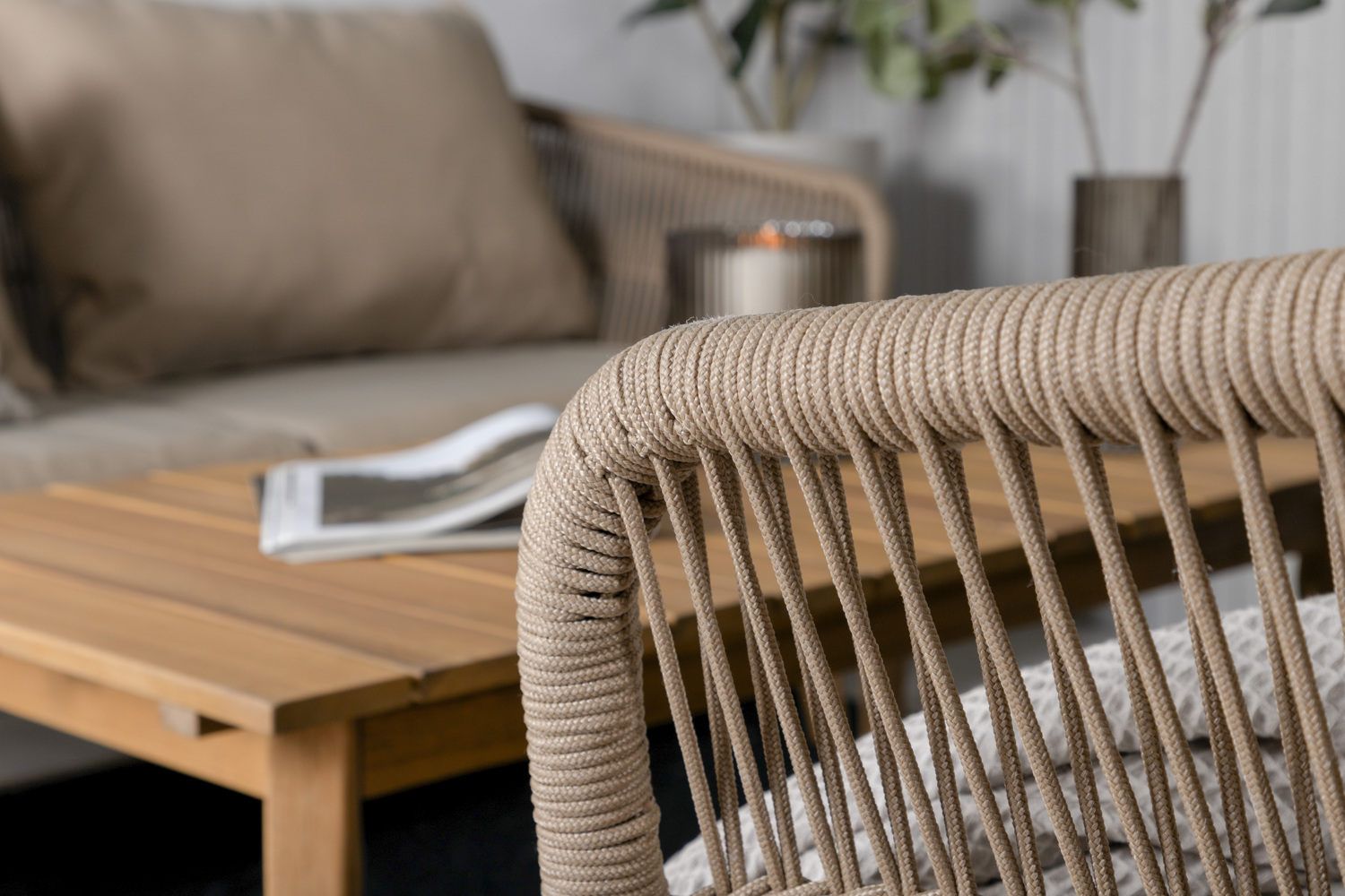 • Alumiinirunko ja akaasiajalat takaavat kestävyyden, kun taas beige polyesteriköysi tuo eleganttia ilmettä ja helppoa puhdistettavuutta.