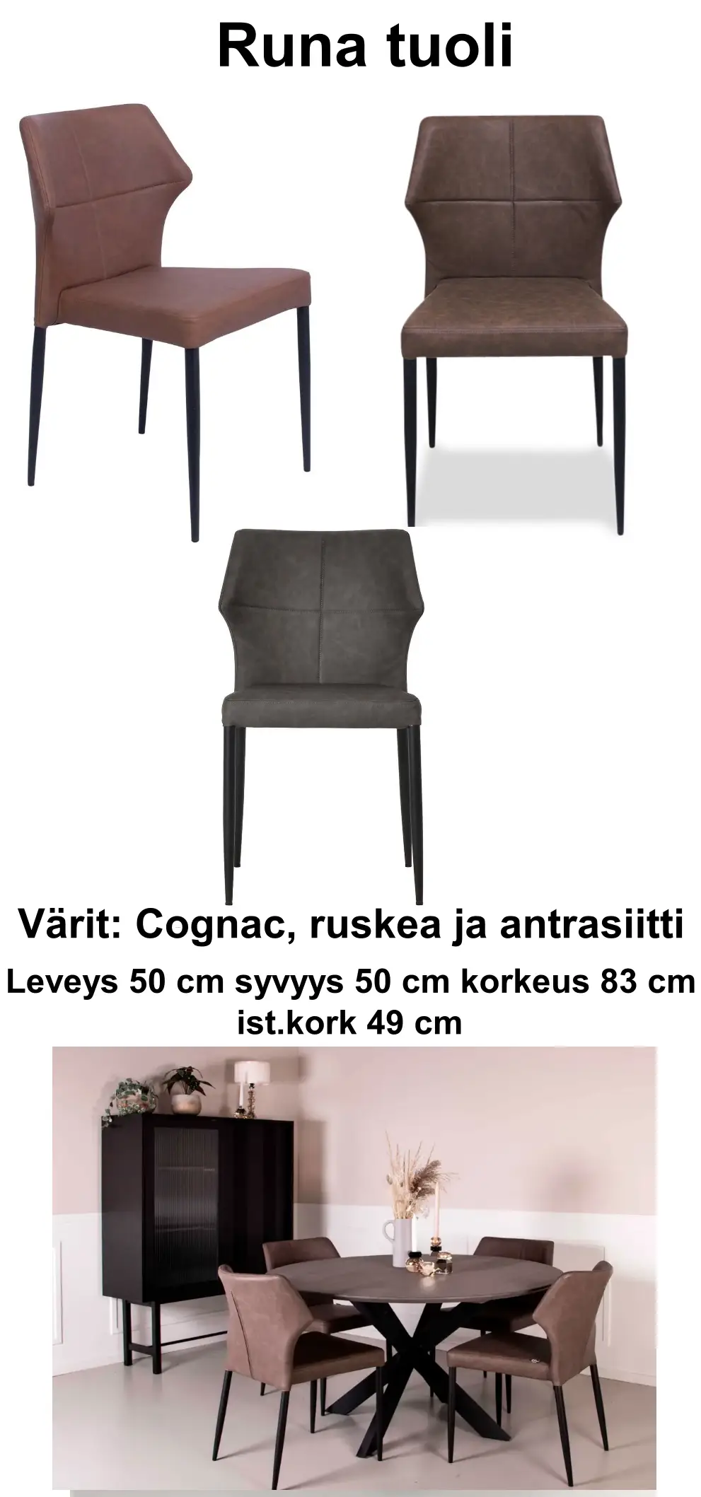 Ruokailuryhmää on helppo laajentaa tilaamalla lisähinnasta lisää Runa-tuoleja tarpeen mukaan. Hoitoöljy auttaa säilyttämään pöydän pinnan kauniina vuosien ajan, ja massiivipuulle ominaiset kosteus- ja kuivuusvaihtelut voivat aiheuttaa halkeamia, jotka ovat normaaleja ja tarvittaessa helposti korjattavissa puukitillä.
