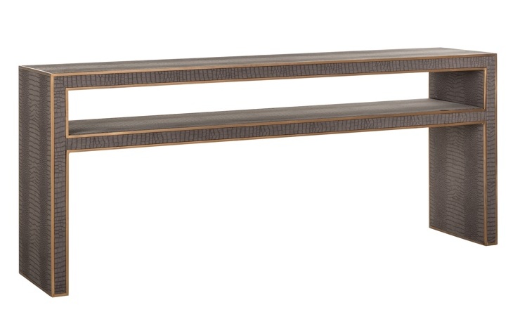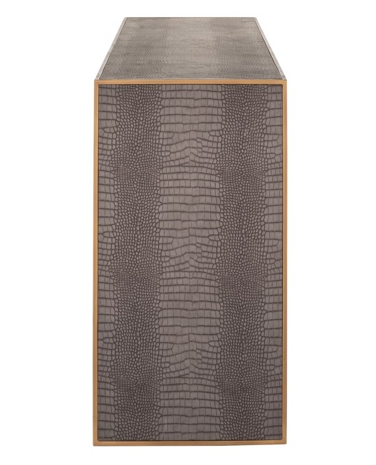 • Ylellinen muotoilu: Classio-konsolipöytä yhdistää harmaan eläinnahkaprintin ja messinginväriset kehykset, luoden elegantin ja modernin ilmeen.