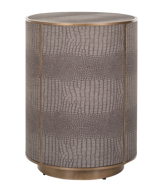 Harmaata eläinnahkakuviota yhdistettynä messinginsävyisiin yksityiskohtiin.