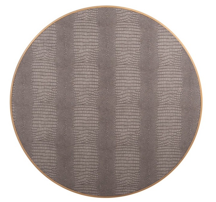 Harmaata eläinnahkakuviota yhdistettynä messinginsävyisiin yksityiskohtiin.