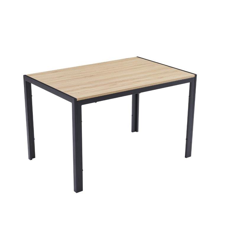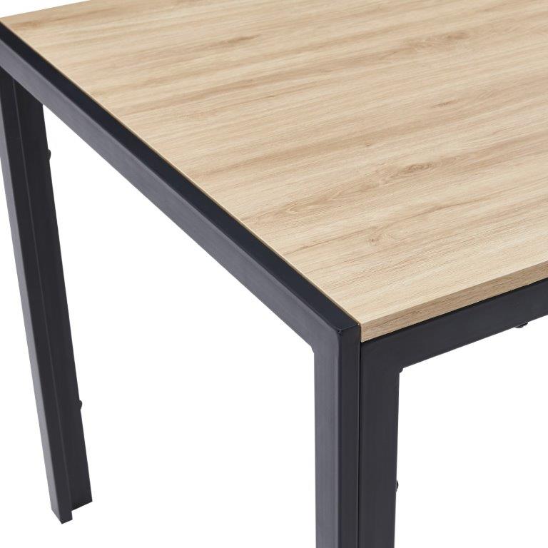 Pöydän tammenvärinen kansi on valmistettu kestävästä MDF-levystä ja viimeistelty laadukkaalla melamiinipinnalla, joka tuo luonnollista puunsävyä ja helppohoitoisuutta. Mustat, pulverimaalatut metallijalat ja alasarja varmistavat tukevuuden ja kestävyyden, säilyttäen samalla modernin ja ilmavan ilmeen.