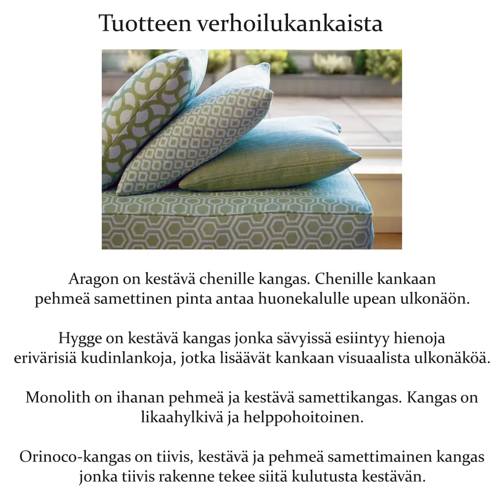 | 115 cm | 65 cm | 44 cm | cm | cm | cm | cm | cm | cm | cm | 5.5 cm | cm | cm | cm | cm | cm | cm | cm | istuintyyny vaahtomuovi 35HR, Vanu | cm | cm | cm | cm | cm | cm | cm | cm | cm | cm | Aracon kangas, Hygge kangas, Monolith kangas, Orinoco kangas | Massiivipuu, Vaneri | Ermatiko värit | cm | kg | cm | cm | cm |