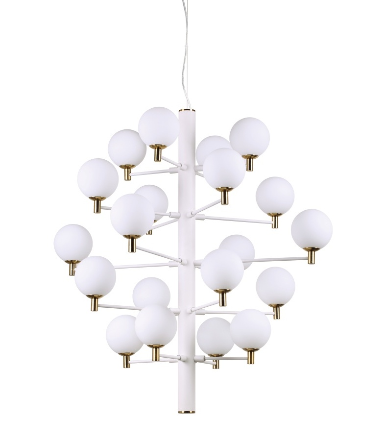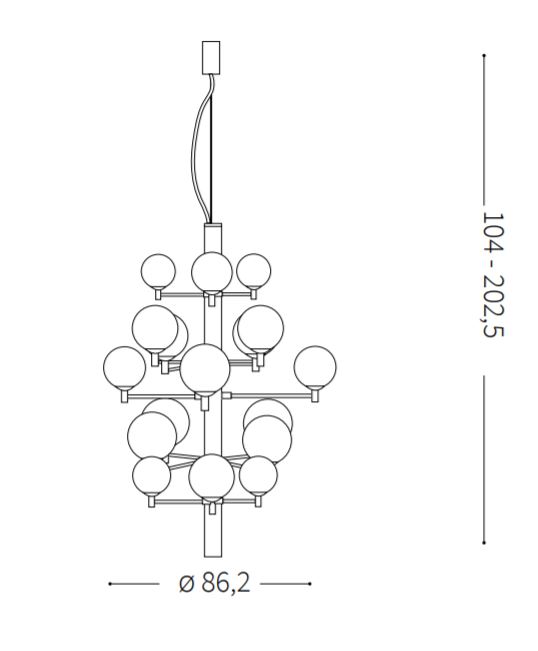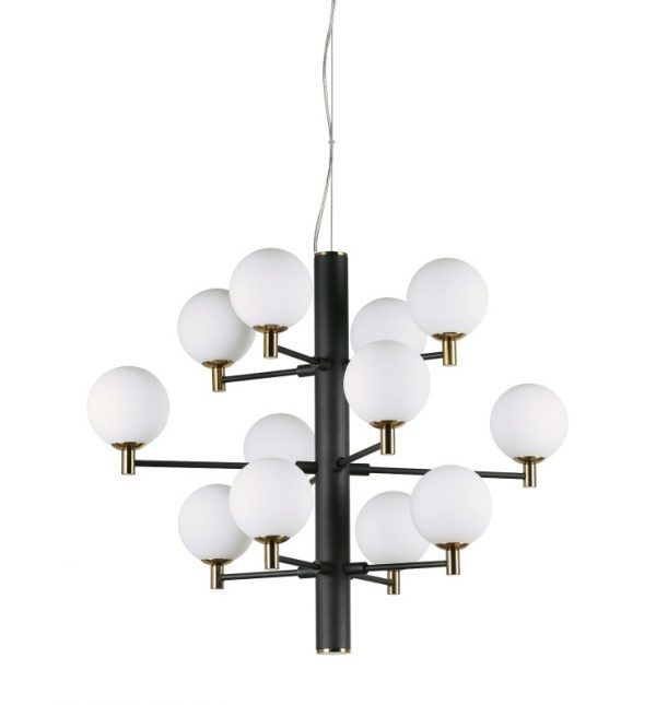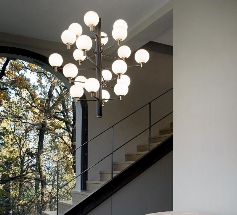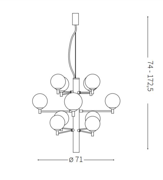- Tyylikäs Copernico riippuvalaisin jossa metallirunko. Yksityiskohdat messinkiä. Varjostimet tehty puhalletusta lasista. Design Italia.