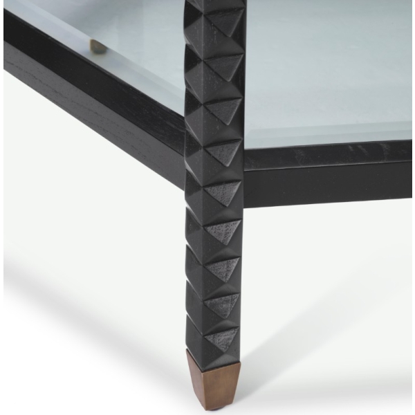 Pöydän kaksi viistettyä lasitasoa tuovat kokonaisuuteen keveyttä ja käytännöllisyyttä. Ylempi taso tarjoaa tyylikkään paikan sisustusesineille, kirjoille tai tarjottaville, kun taas alempi taso lisää säilytystilaa säilyttäen ilmavan ilmeen. Cornelius yhdistää funktionaalisuuden ja klassisen luksuksen tavalla, joka sopii täydellisesti korkeatasoiseen sisustukseen.
