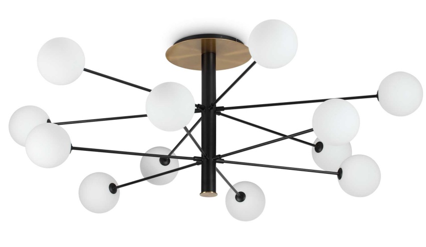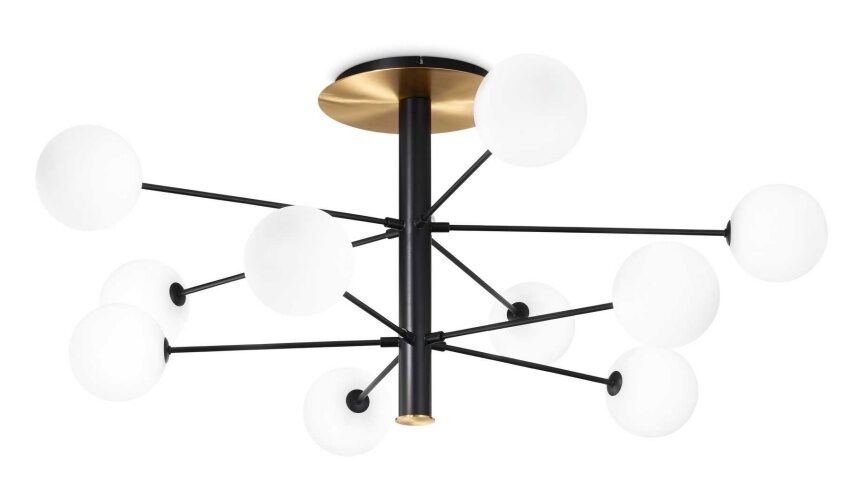 Tyylikäs Cosmopolitan kattovalaisin edustaa modernia italialaista designia, jossa musta metallirunko ja messinkiset yksityiskohdat luovat voimakkaan mutta elegantin kontrastin. Happoetsatusta ja puhalletusta lasista valmistetut varjostimet pehmentävät valoa ja tuovat valaisimeen hienostunutta, viimeisteltyä ilmettä.