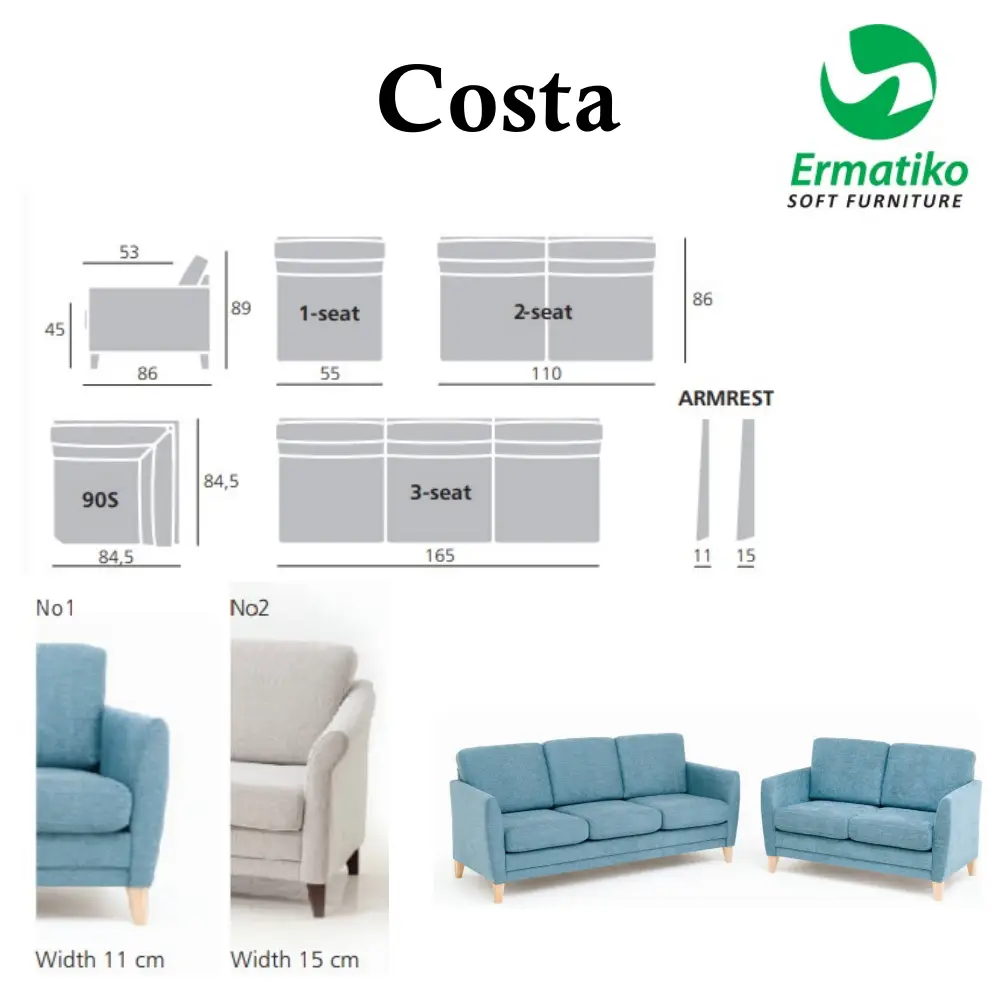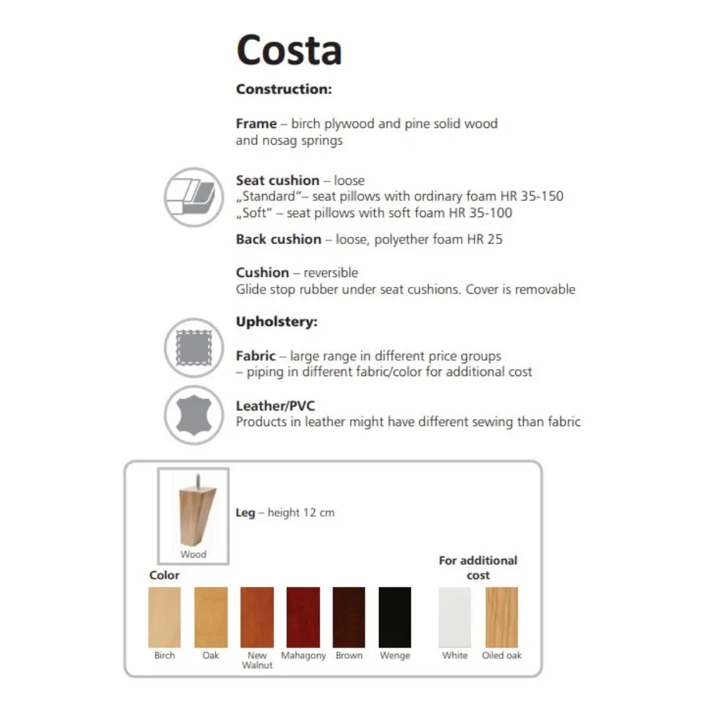 Ajaton, suoralinjainen Costa sarjan nojatuoli, jossa istuintyynyt ovat irtonaiset, mutta osat pysyvät hyvin paikoillaan tyynyn alla sijaitsevan kumin ansiosta. Tuolin ajaton muotoilu sopii niin perinteiseen kuin modernimpaankin sisustustyyliin. Istuimissa oleva zig-zag jousitus ja laadukkaat pehmusteet takaavat napakan istuinmukavuuden. Voit valita tuolin istuinkorkeuden joko 45 cm, 48 cm tai 51 cm valitsemalla joko 12 cm, 15 cm tai 18 cm jalat.