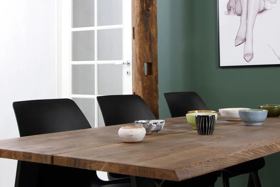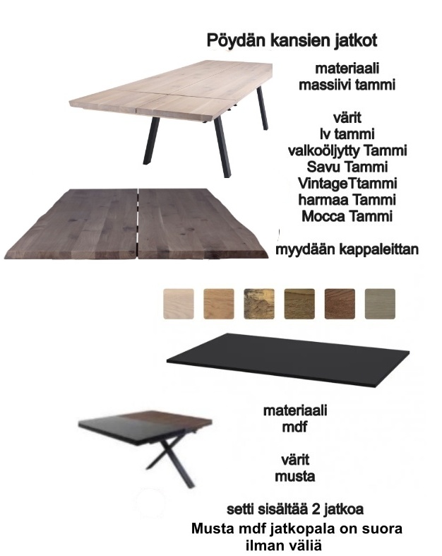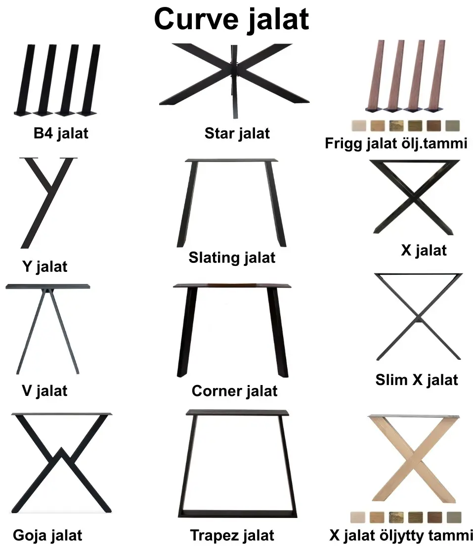Curve-ruokapöydän 3 cm paksu massiivipuinen kansi on viimeistelty öljyllä ja lakalla, ja se on saatavilla kuudessa eri öljykäsittelyn sävyssä. Lisähinnasta pöytään on mahdollista valita vaihtoehtoiset jalkamallit sekä tilata yksi tai kaksi jatkopalaa joko mustana tai tammisena, kun tarvitset lisää tilaa arkeen tai juhlaan.