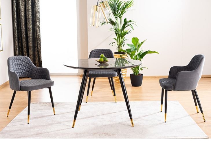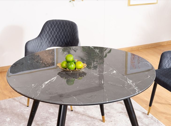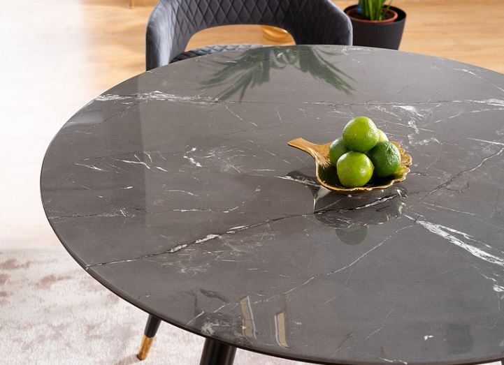 Cyryl II -pyöreä ruokapöytä tuo kotiisi hienostunutta modernia tyyliä mustalla MDF- ja marmorikuvioidulla lasipinnallaan, luoden näyttävän keskipisteen ruokailutilaan.