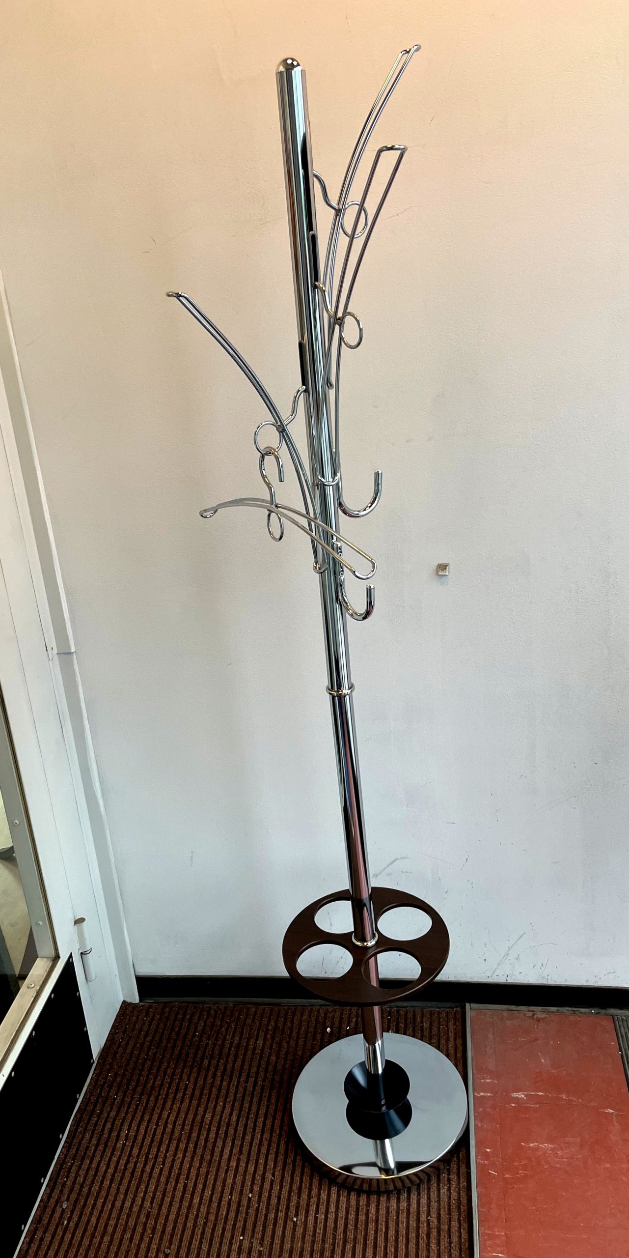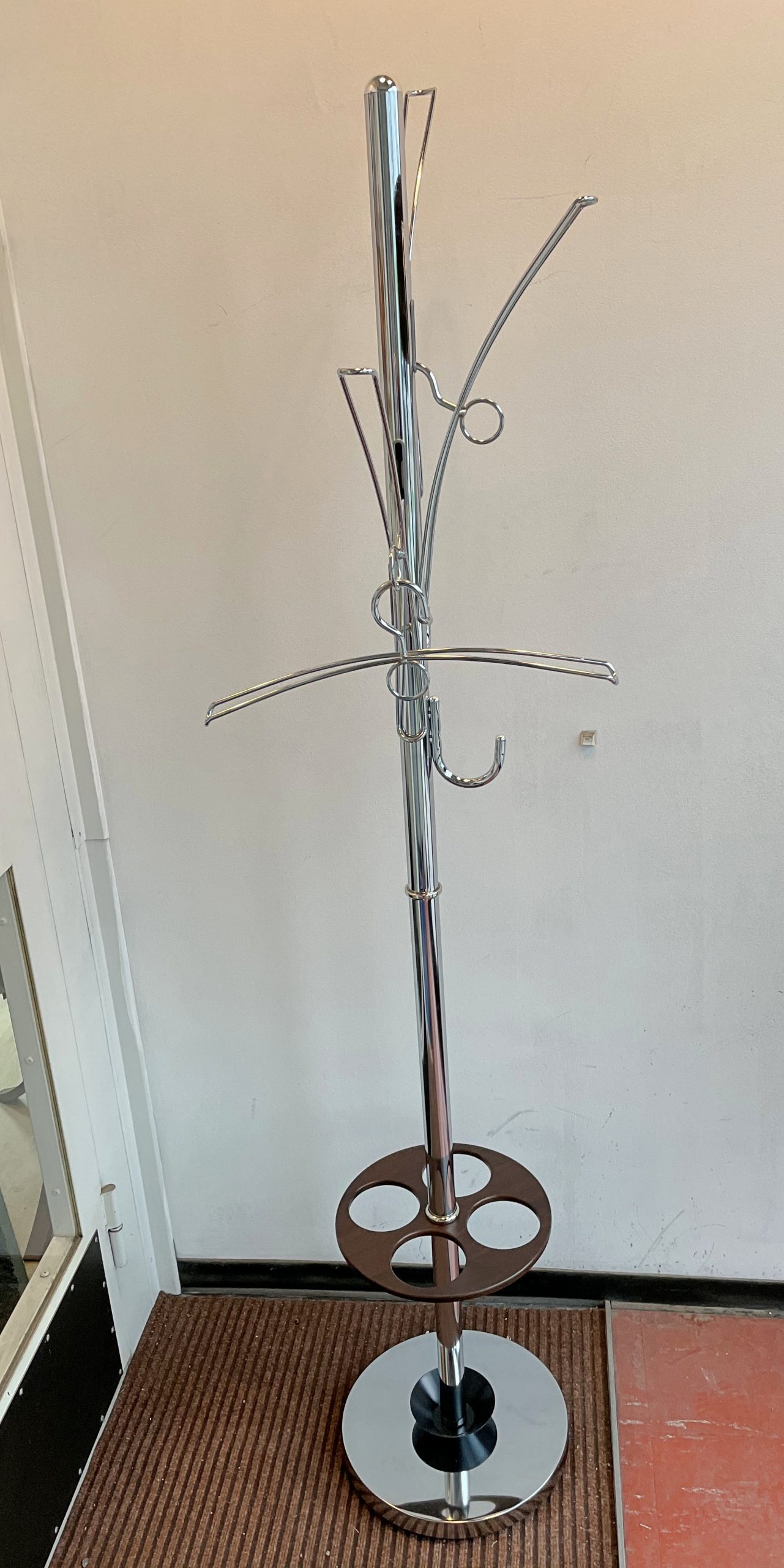Tukeva, metallivartinen pystynaulakko jossa irrotettavia henkareita (4kpl) – kiinnitettynä toimii koukkuna ja irrotettavana voidaan sijoittaa henkarina naulakkoon. Naulakon alareunassa sateenvarjoteline. Toimitus osina.