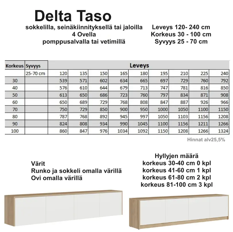 Delta taso tarjoaa täysin mittoihin räätälöitävän ja laadukkaista kotimaisista materiaaleista valmistetun säilytysratkaisun, joka mukautuu eri tiloihin ja käyttötarpeisiin. Valmiiksi koottuna toimitettava senkki tekee hankinnasta helppoa ja tarjoaa hakukoneystävällisen, modernin vaihtoehdon kotiin.