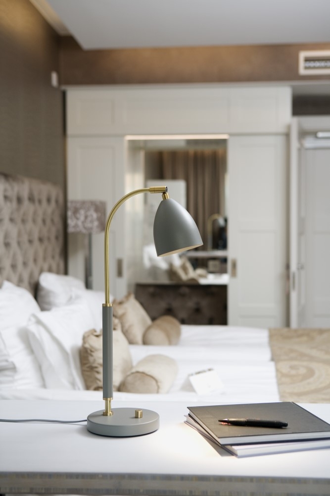 Deluxe pöytävalaisin on upea metallinen design-valaisin, jossa moderni ilme yhdistyy hienostuneisiin messinkisiin yksityiskohtiin. Valkoinen, musta tai harmaa värivaihtoehto tekee valaisimesta helposti yhdisteltävän niin skandinaaviseen kuin moderniin sisustukseen, ja sen siro mutta näyttävä muoto viimeistelee tilan tyylikkäästi.