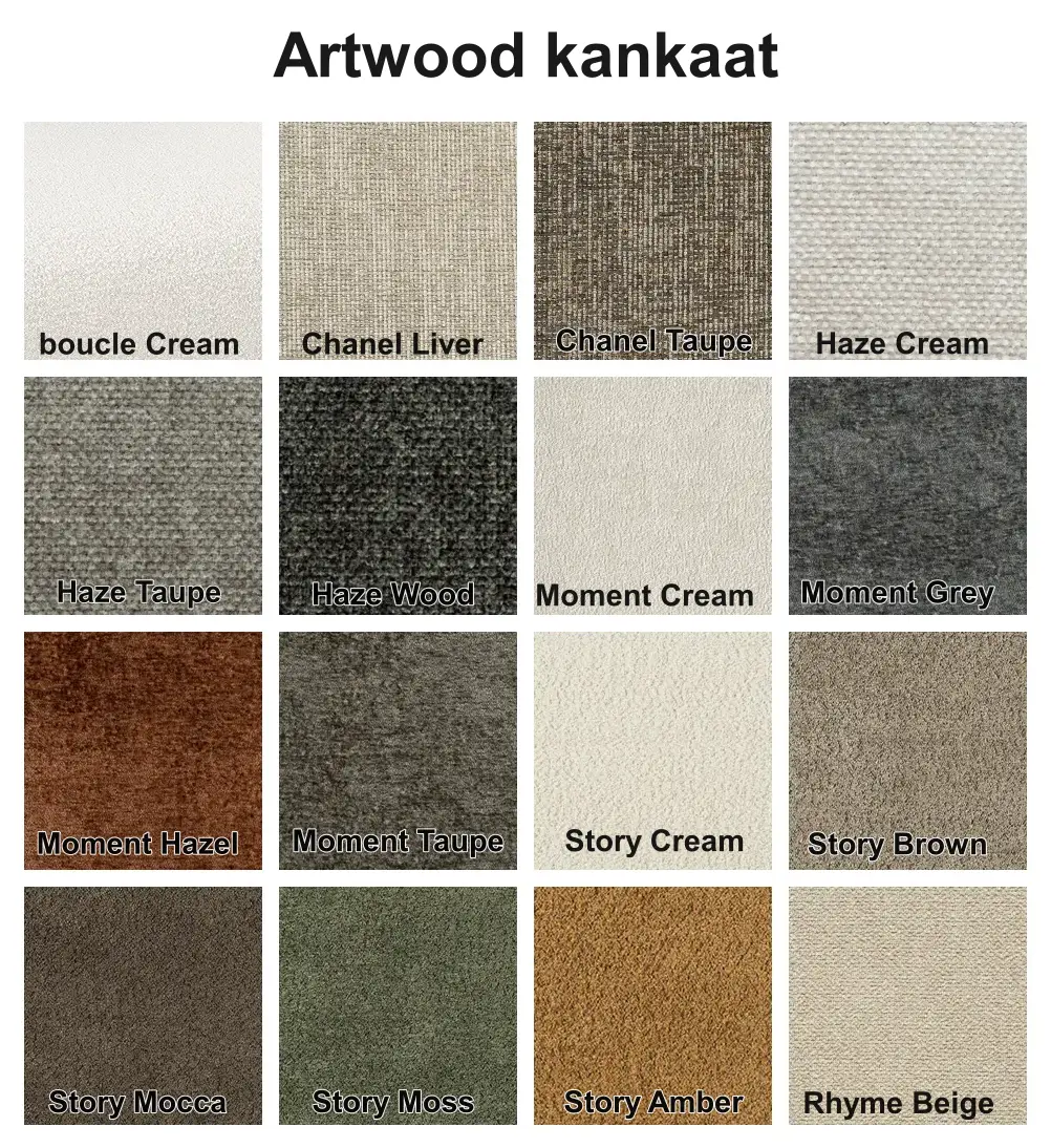 Sohva on saatavilla viidellä eri korkealaatuisella kankaalla, jotka antavat mahdollisuuden räätälöidä kokonaisuus täysin omaan tyyliisi: pehmeä Bouclé, elegantti Chanel, hienostunut Haze, moderni Moment sekä ajaton Story. Jokainen kangas tuo esille sohvan kauniin muodon eri tavalla, joten valitsitpa minkä tahansa, lopputulos on aina upea.