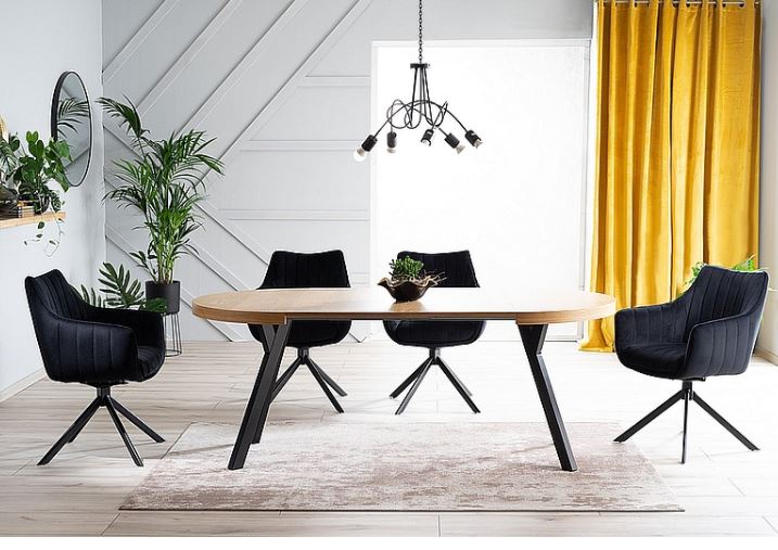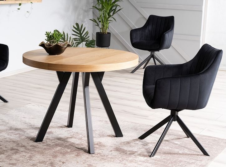 Musta metallijalka yhdistettynä luonnollisiin tammen tai mustan sävyihin luo modernin ja raikkaan sisustuselementin, joka sopii saumattomasti skandinaaviseen kotiin.