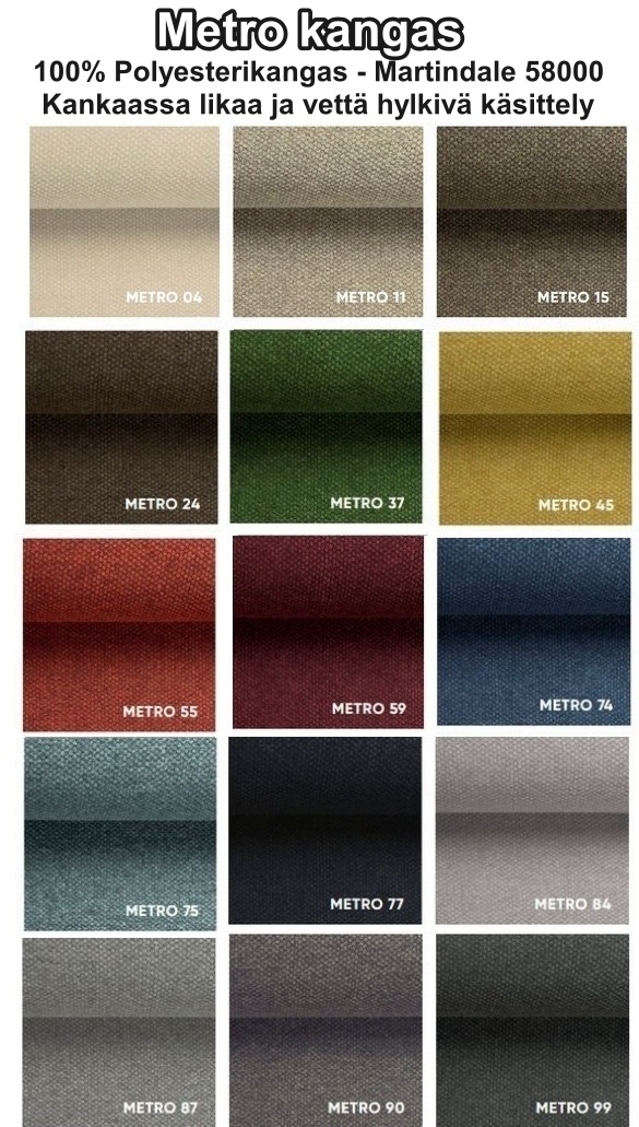 Metro kangas: Kestävä ja erittäin helppohoitoinen 100% Polyesterikangas joka valmistettu Smart-teknologialla, kankaan pinta on käsitelty vettä- ja likaahylkivällä hydrofobisella suojakalvolla, joka suojaa lian ja nesteiden imeytymistä kankaaseen. Kangas ulkonäöltään tiivispintainen, ristikudokset lievästi näkyvissä. Ihontuntuma sileähkö. Hankauskesto 58 000 Martindalea. Pesu: lika poistetaan kevyesti painelemalla, tarvittaessa kevyt vesi/saippualiuos. vesipesu 30 °.