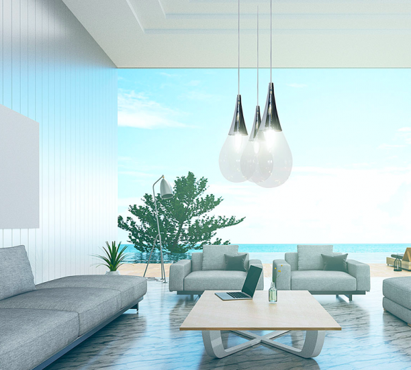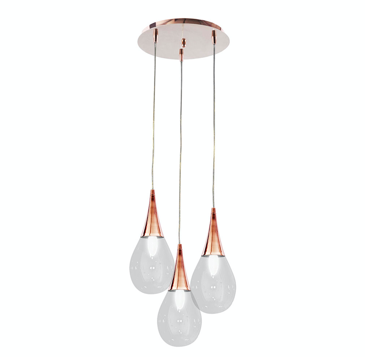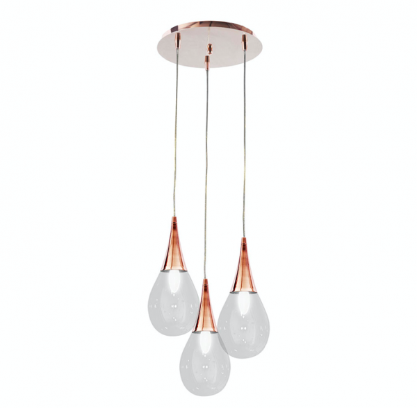- Tyylikäs ja upea Drop 3 riippuvalaisin jossa kuparin värinen runko sekä hiekan sävyinen lasi. Valaisimen korkeutta mahdollista säädellä 3 metrin johdolla.