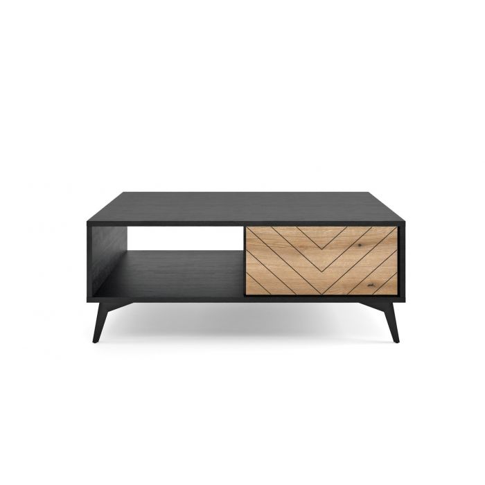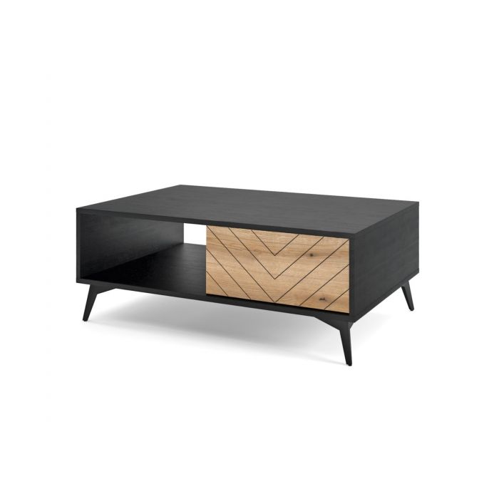 Dumont-sohvapöytä tuo olohuoneeseen vaikuttavaa ilmettä näyttävällä muotoilullaan ja huolitelluilla yksityiskohdillaan. 16 mm laminoidusta kalustelevystä valmistettu runko ja ABS-reunanauhat tekevät pöydästä kestävän ja laadukkaan, kun taas mustat metallijalat tuovat kokonaisuuteen modernia ryhtiä ja ilmavuutta.