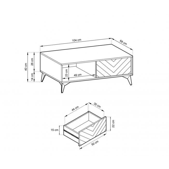 Leveydeltään 103,5 cm, syvyydeltään 68 cm ja korkeudeltaan 39,5 cm oleva sohvapöytä istuu täydellisesti erikokoisiin olohuoneisiin ja tarjoaa riittävästi laskutilaa ilman, että tila tuntuu ahtaalta. Toimitus osina helpottaa kuljetusta ja kokoamista.