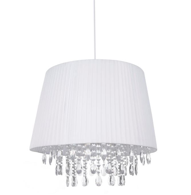 - Valkoinen 46 cm varjostin. Valaisimesta riippuu monta tyylikästä kristallia. Valaisin tulee valmiiksi kasattuna