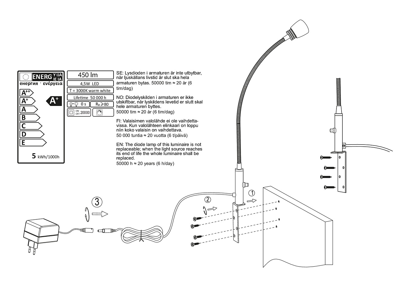 3 watin LED-valonlähde tuottaa 270 lumenin kirkkauden miellyttävällä 2700K lämpimän valkoisella sävyllä. Pitkä 240 cm virtajohto lisää sijoittelun joustavuutta, ja mukana toimitettavat polttimot takaavat vaivattoman käyttöönoton heti asennuksen jälkeen.