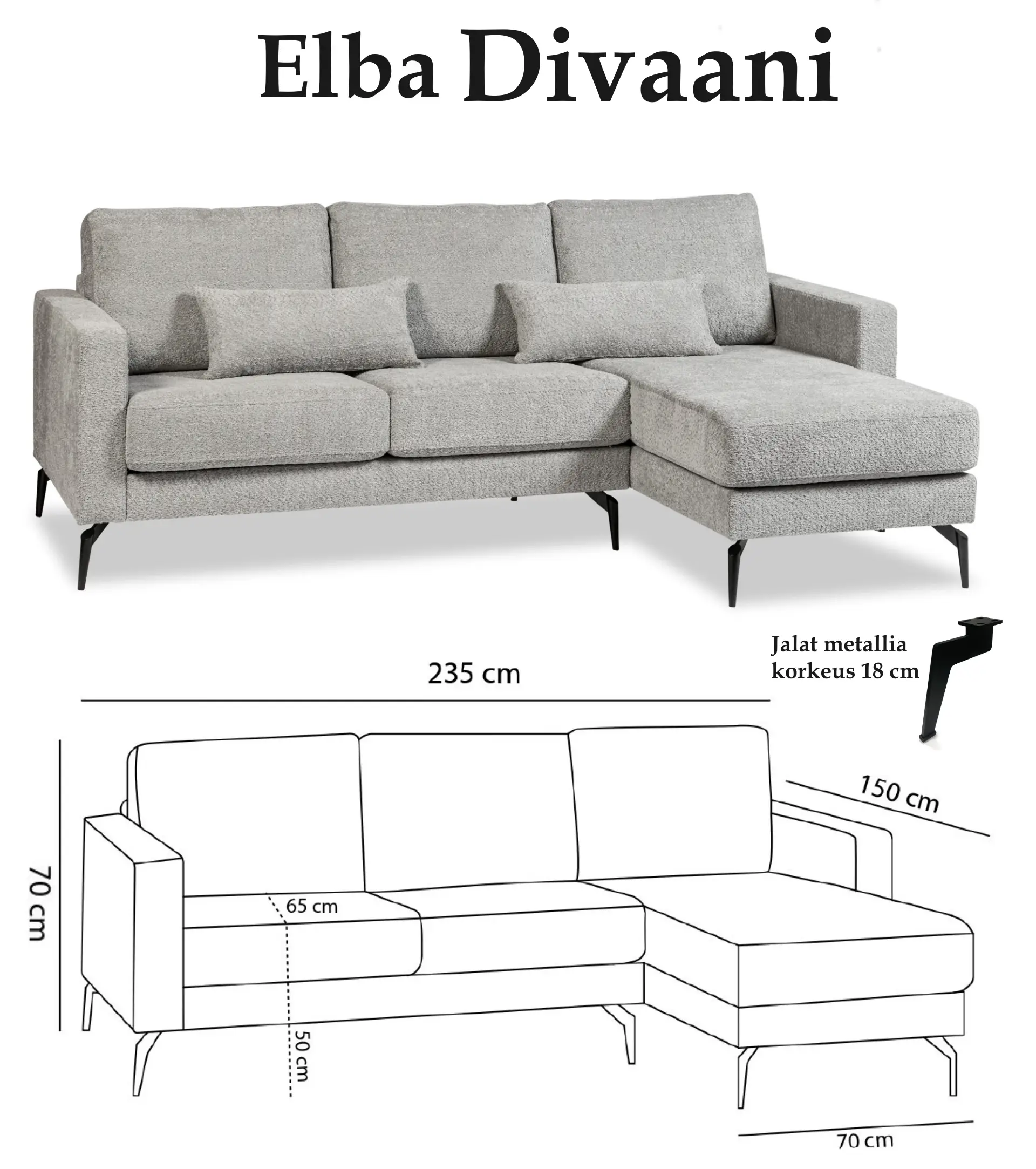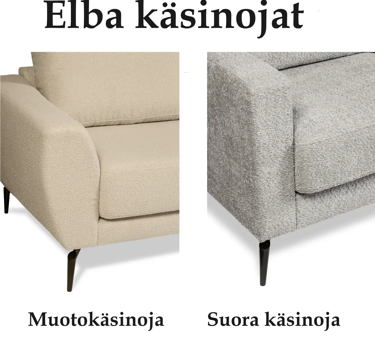 Elba divaanisohva on moderni ja monipuolinen valinta, joka tarjoaa sekä mukavuutta että käytännöllisyyttä. Runko on laadukasta massiivipuuta, kalustelevyä sekä vaneria. Laadukkaan pussijousituksen ansiosta Elba sohva tarjoaa erinomaisen sekä kestävän istuintuntuman. Elba sohvaan on valittavissa 2 erilaista käsinojaa. Jalkoina tyylikkäät mustat metallijalat. Huom. Kuvan koristetyynyt eivät sisälly sohvaan. Yhdistä sohvaan saman sarjan Elba rahi, jolloin saat sohvasta vaivattomasti vuodesohvan.