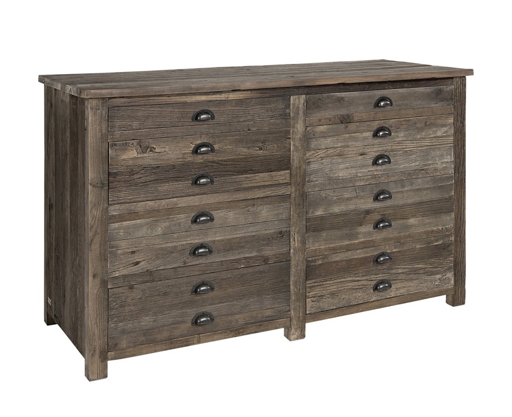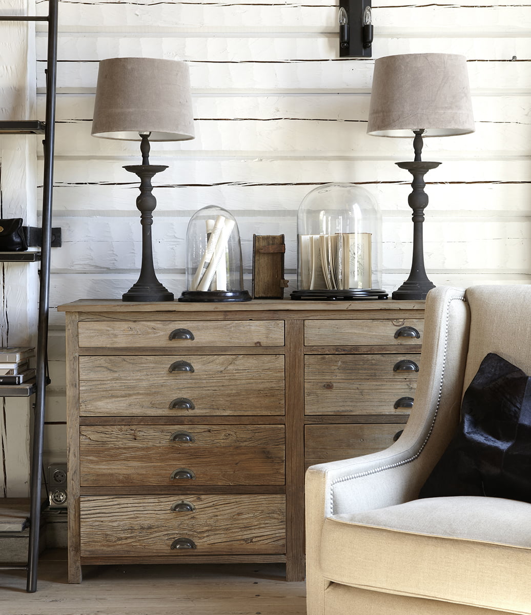 Elmwood lipasto/senkki hurmaa autenttisella maalaistyylillään, jossa antiikinharmaa Old Elm -pintakäsittely ja tyylikkäät metallivetimet luovat lämpimän, vintage-henkisen ilmeen. Jalavapuun luonnolliset syyt ja pintakuviot jäävät kauniisti näkyviin, ja pinnassa voi esiintyä pieniä halkeamia, naulanreikiä ja värieroja — juuri nämä yksityiskohdat tekevät jokaisesta Elmwood-kalusteesta yksilöllisen ja ainutlaatuisen.