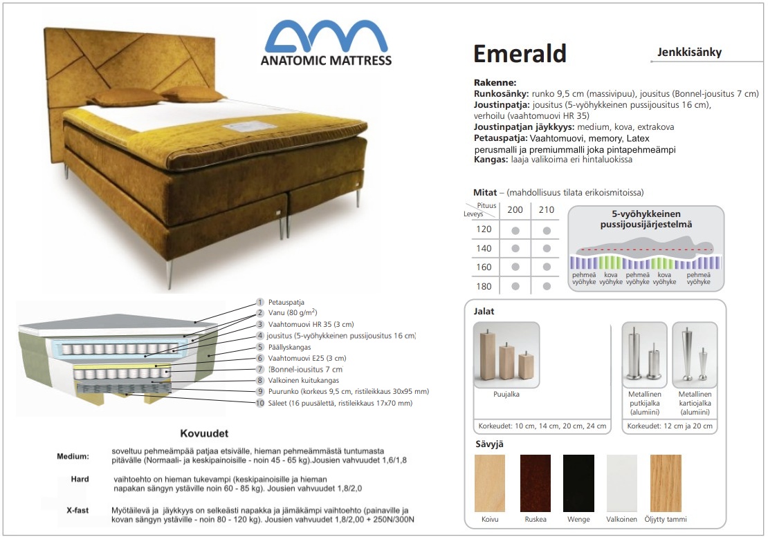 Emerald-jenkkisänky on saatavilla kolmella eri kovuudella – medium, hard ja X hard – ja voit viimeistellä sen mukavuuden valitsemalla kolmesta erilaisesta sijauspatjasta: vaahtomuovi, viskoelastinen memory tai latex. Jokaisesta vaihtoehdosta löytyy perus- ja premium-versio, ja kaikissa on irrotettava, vesipestävä päällinen helppoa huoltoa varten. Laadukkaat pehmustemateriaalit ja useat verhoiluvaihtoehdot viimeistelevät kokonaisuuden tyylikkäästi.