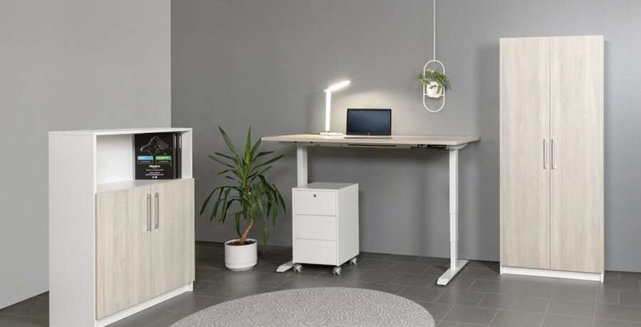 Kaapin viisi hyllytasoa korkeiden ovien takana tarjoavat runsaasti säilytystilaa kansioille, mapille ja toimistotarvikkeille. Tilan tehokas käyttö pitää työpisteen siistinä ja mahdollistaa helpon järjestyksen ylläpidon myös pienemmissä tiloissa.