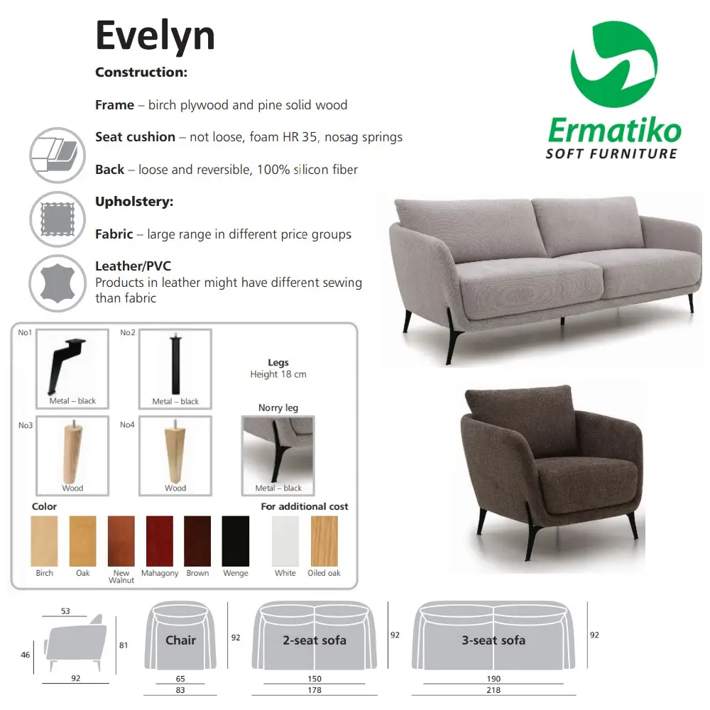 Upean muotoilun omaava Evelyn sarjan nojatuoli on suunniteltu huolellisesti laadukkaita materiaaleja käyttäen. Tuolin istuintuntuma on napakka. Evelyn nojatuoli on verhoiltu laadukkaalla ja kestävällä kankaalla. Nojatuoliin on saatavana niin puujalat, kuin metallijalat ja jalkoja on saatavana eri sävyissä sekä malleissa. Toimitus koottuna, vain jalat kiinnitettävä paikoilleen. Samasta sarjasta on saatavana myös 2 ja 3 ist sohvaa.
