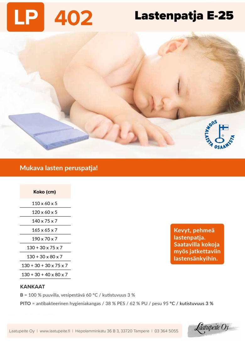 Lastensängyn jatkettava patja on valmistettu Suomessa ympäristöystävällisestä kierrätysmateriaalista, joka tarjoaa lapsellesi pehmeän ja turvallisen nukkuma-alustan. Patja on kevyt, hengittävä ja täysin haitta-aineeton – täydellinen valinta terveelliseen ja levolliseen uneen.
