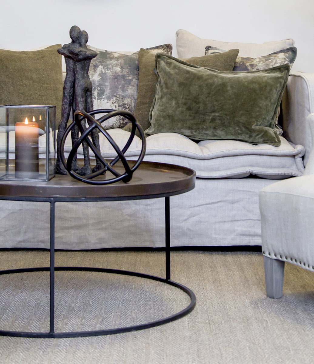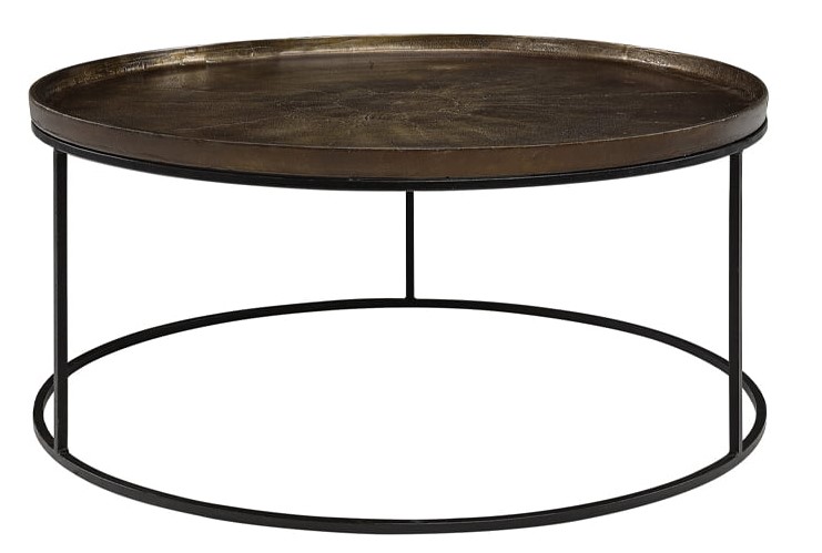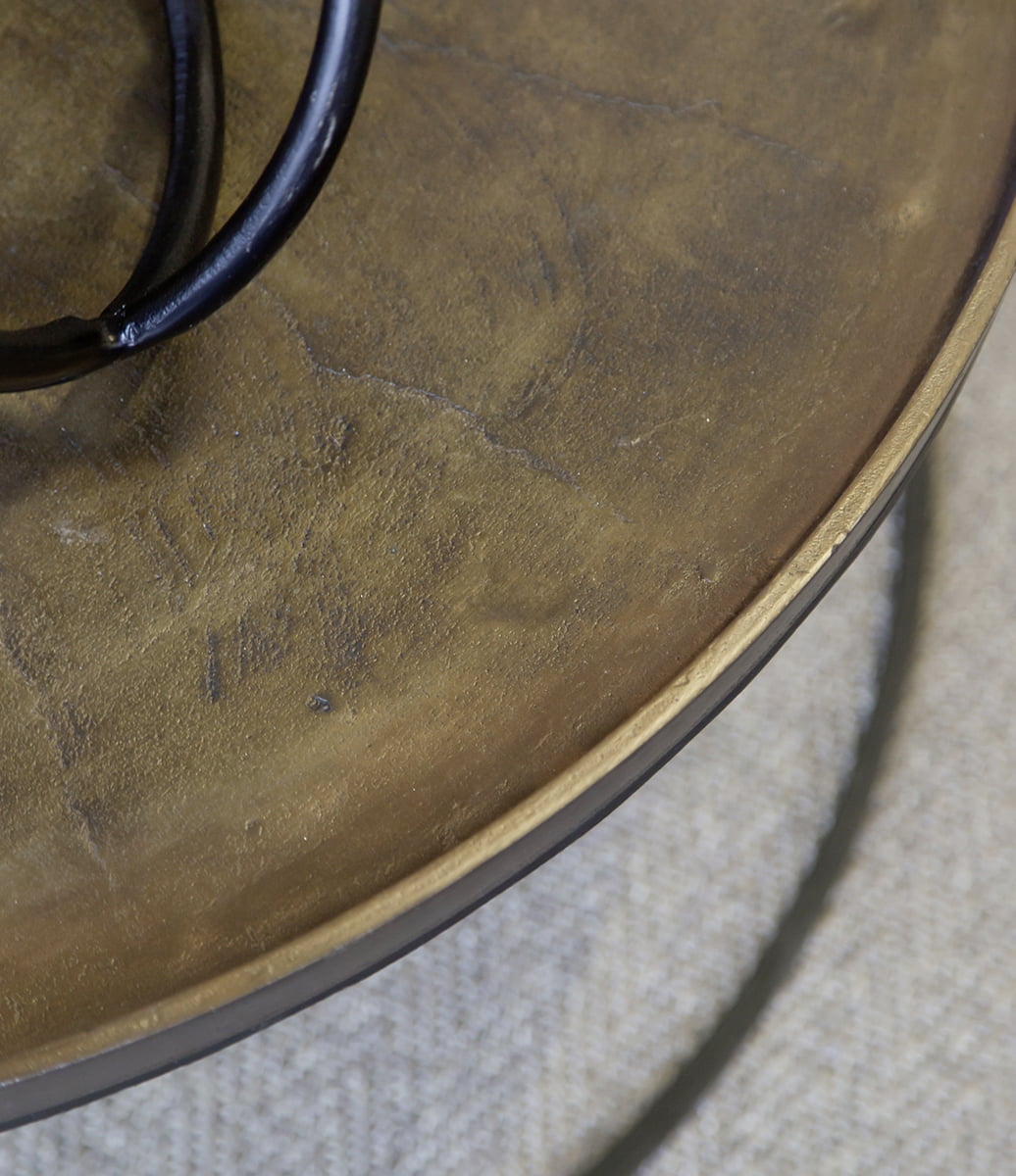 Fabio-sohvapöytä yhdistää näyttävän vintage-messinkikannen ja modernin mustan rungon, luoden tasapainoisen kokonaisuuden, joka sopii sekä klassiseen että nykyaikaiseen sisustukseen. Jokainen pöytä on uniikki yksilö, mikä tuo kotiin persoonallisen ja erottuvan ilmeen.
