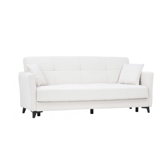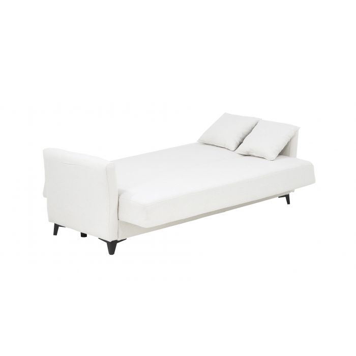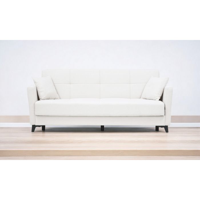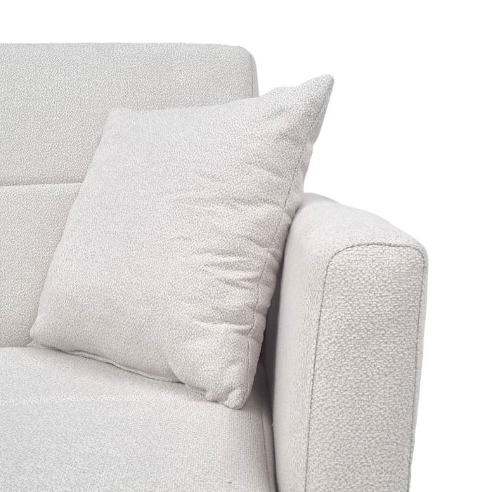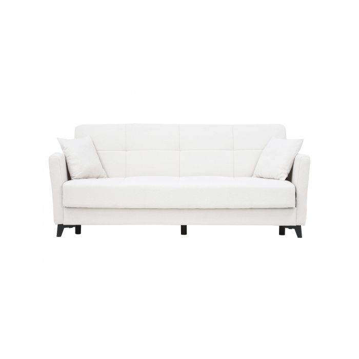 Felt-vuodesohva on kolmen istuttava, tyylikkäästi muotoiltu kaluste, joka yhdistää modernin ilmeen ja käytännöllisyyden samaan kokonaisuuteen. Luonnonvalkoinen 100 % polyesteriverhoilu (Martindale 20 000) näyttää raikkaalta ja kestää hyvin päivittäistä käyttöä, ja mukana tulevat 40×40 cm irtotyynyt tuovat sohvaan pehmeän viimeistelyn. Tukeva puu–kalustelevyrunko ja Bonnel-jousitus takaavat sohvalle erinomaisen istuttavuuden ja pitkän käyttöiän.