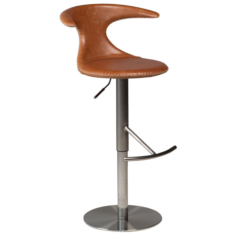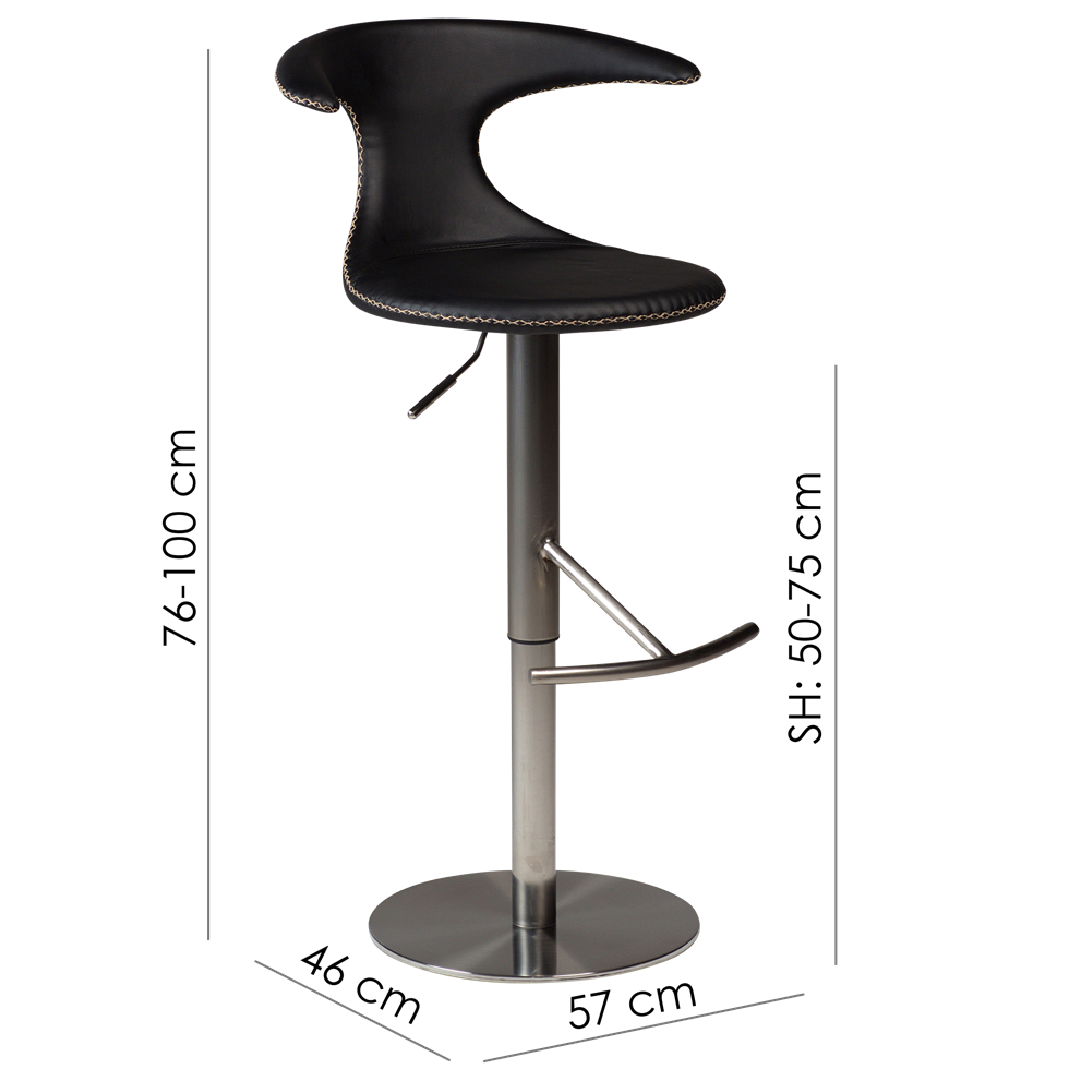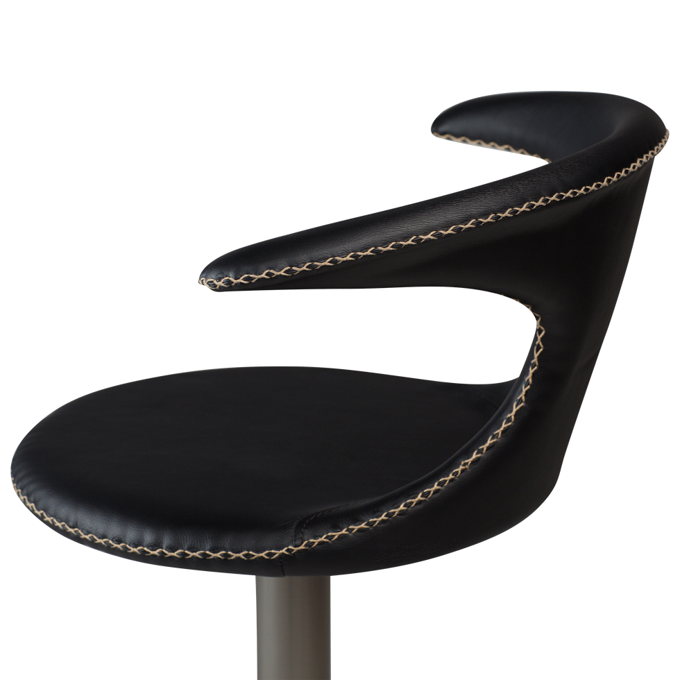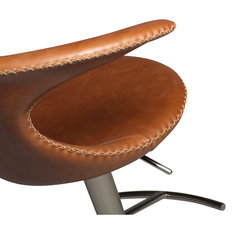 Kaasujousella toimiva korkeudensäätö mahdollistaa istuinkorkeuden tarkan muokkaamisen juuri käyttötarpeen mukaan, ja ergonominen selkänoja tuo lisää istuinmukavuutta. Taivutettu vaneri-istuin on verhoiltu aidolla nahalla, joka kestää käyttöä ja tarjoaa ylellisen tuntuman. Harjatusta teräksestä valmistettu pyöreä jalka tuo kokonaisuuteen modernia ryhtiä ja kestävyyttä.